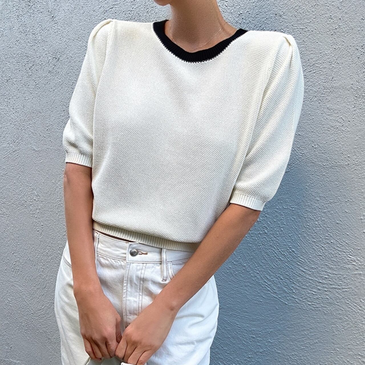 襟元の配色がコーデを引き締めるツートーンカラーの半袖ニットです。 タック入りのパフスリーブがアクセントとなり、カジュアルな中にも洗練された上品な印象を与えます。 幅広いスタイルにコーディネートしやすく、デイリーユースに最適な一着です! ◇カラー ホワイト ブラック ◇素材 コットン ◇サイズ S 肩幅:33cm 胸囲:110cm 着丈:53cm 袖丈:33.5cm M 肩幅:34cm 胸囲:114cm 着丈:55cm 袖丈:34.5cm L 肩幅:35cm 胸囲:118cm 着丈:57cm 袖丈:35.5cm