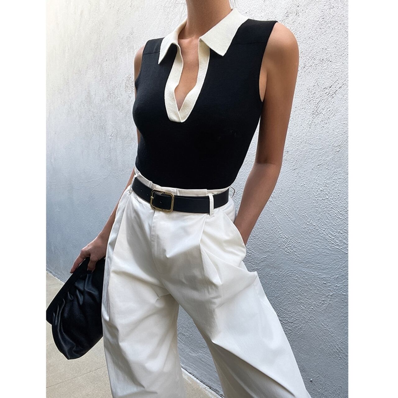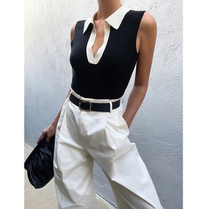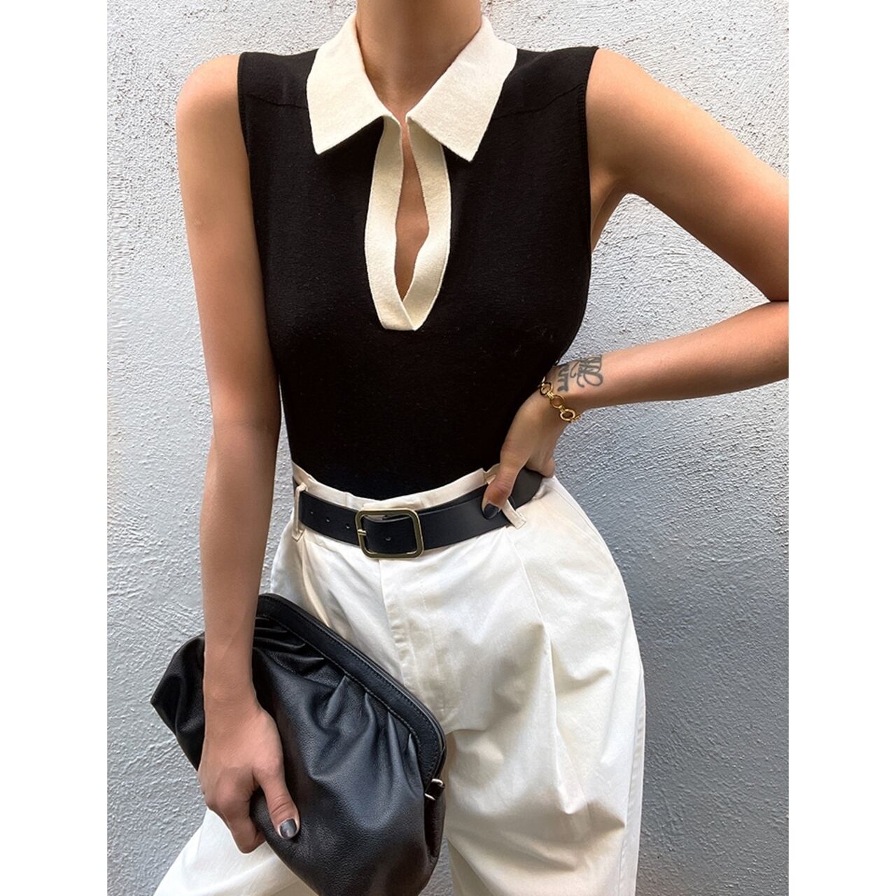 襟元の配色がコーデを引き締めるツートーンカラーのキーネックノースリーブニットです。 シックなモノトーンがアクセントとなり、カジュアルな中にも洗練された上品な印象を与えます。 幅広いスタイルにコーディネートしやすく、デイリーユースに最適な一着です! ◇カラー ブラック ブラウン ◇素材 アクリル ◇サイズ S 肩幅:37cm 胸囲:76cm 着丈:49cm M 肩幅:38cm 胸囲:80cm 着丈:50cm L 肩幅:39cm 胸囲:84cm 着丈:51cm