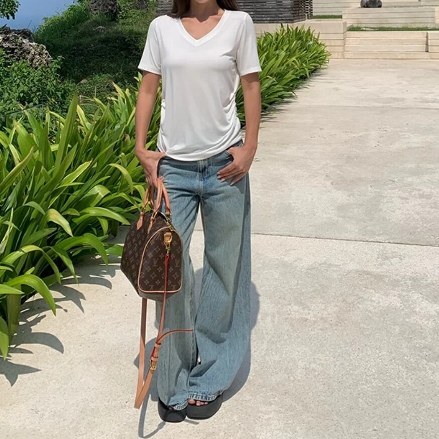 シンプルで汎用性の高いVネックTシャツ。 Vネックスタイルは、肩、首、鎖骨のエレガントで魅力的なラインを演出します。 インナーシャツとしても、1枚でトップスとしても着用できる万能アイテムです。 ◇カラー ブラック ホワイト グレー カーキ ◇素材 ビスコース スパンデックス ◇サイズ:S,M,L S 肩幅:38.5cm胸囲:86cm着丈:55cm 袖丈:21cm M 肩幅:39.5cm胸囲:90cm着丈:56.5cm 袖丈:21.5cm L 肩幅:40.5cm胸囲:94cm着丈:58cm 袖丈:22cm ◇モデル 身長173cm:Sサイズ着用