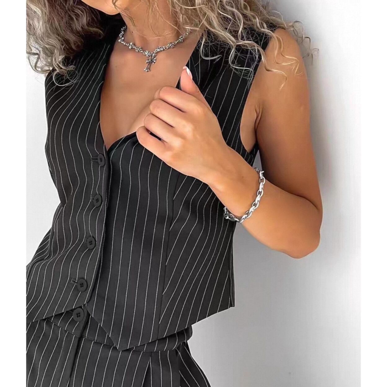 キメすぎないのにセンスが光る、大人のカジュアルセットアップ。 ストライプのベストはインナーを選ばず着回し力抜群。ワイドパンツは楽ちんなのに、しっかり脚長見え! ちょっとしたお出かけにも、休日のリラックスコーデにもぴったりなアイテムです。 薄手なので暑い日にも! ◇カラー ブラウン ダークブラウン ブラック ◇素材 ポリエステル スパンデックス ◇サイズ:S,M,L トップス S 胸囲:89cm着丈:57cm M 胸囲:93cm着丈:58cm L 胸囲:97cm着丈:59cm パンツ S ウエスト:64cm ヒップ:98cm パンツ丈:111cm M ウエスト:68cm ヒップ:102cm パンツ丈:112cm L ウエスト:72cm ヒップ:106cm パンツ丈:113cm