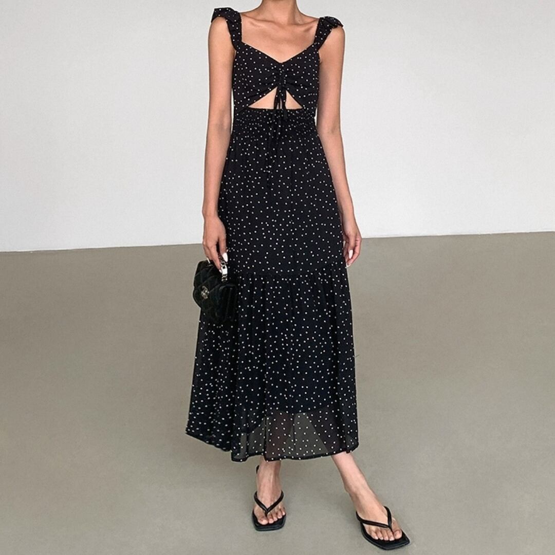 クラシカルなドット柄とトレンド感あふれた一着。Vネックがデコルテを美しく魅せ、フライングスリーブが軽やかな女性らしさを演出します。ロング丈で体型カバーしつつ、動くたびに揺れるシルエットが魅力的です。