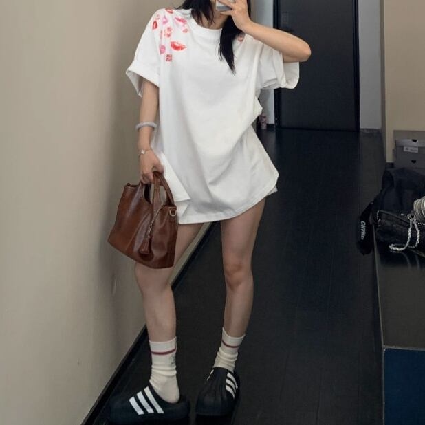 アメリカンレトロな雰囲気をワンポイントで目を惹くリップ刺繍が、大人の遊び心を演出するホワイトTシャツ。肌ざわりの良い純綿素材と、ゆるっと着られるレイジーシルエットで、夏のリラックススタイルにぴったり。シンプルなのに印象的な1枚です。