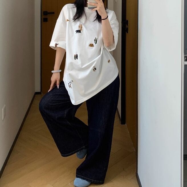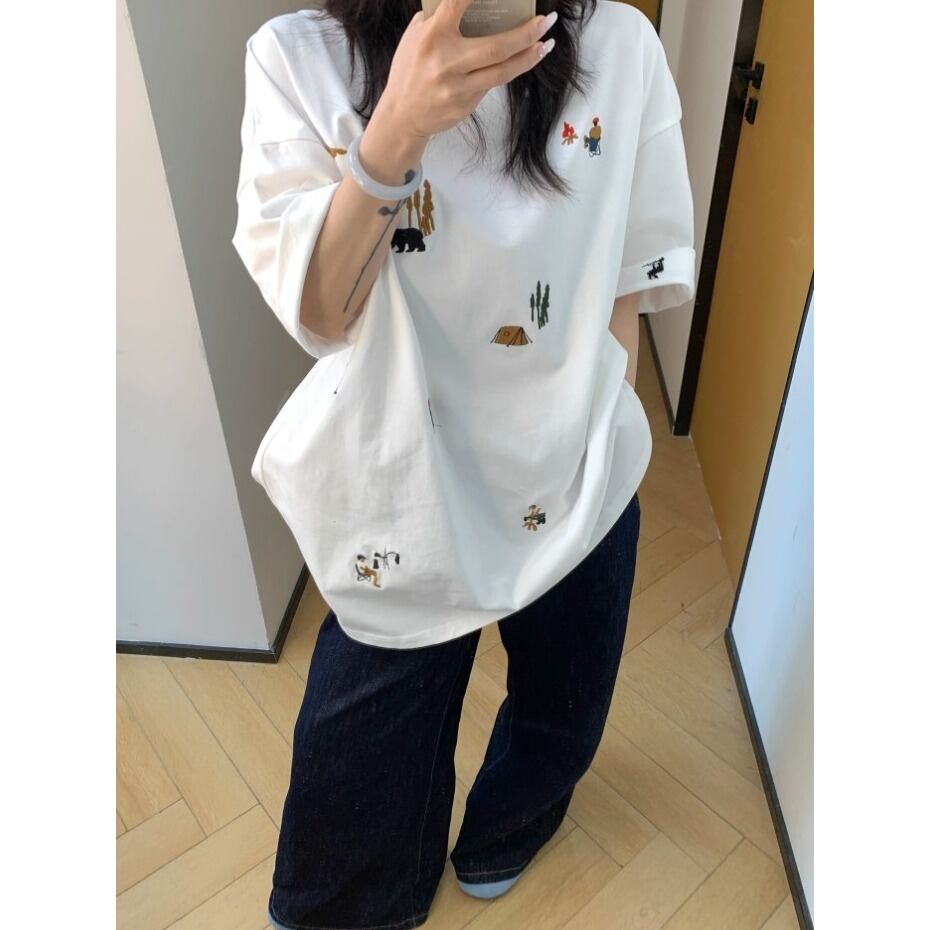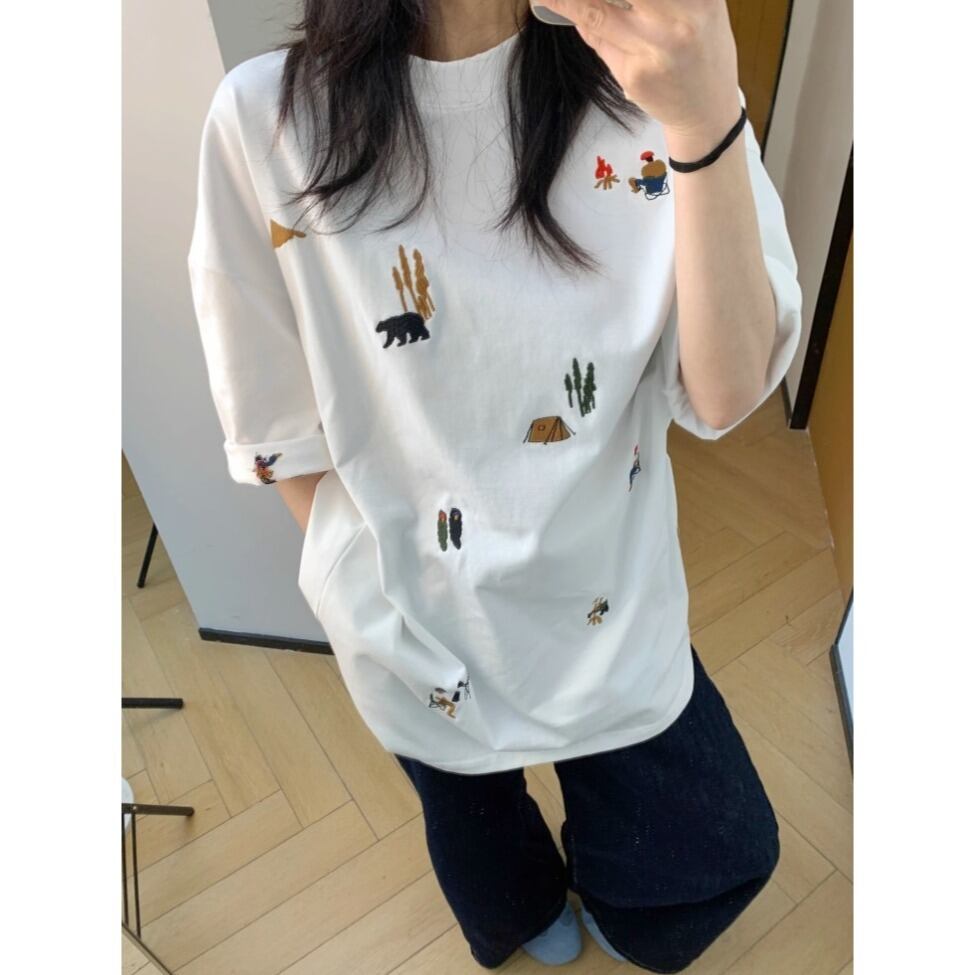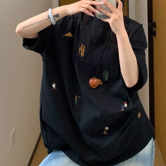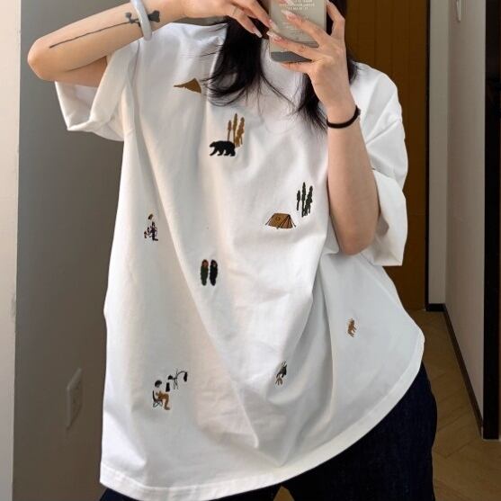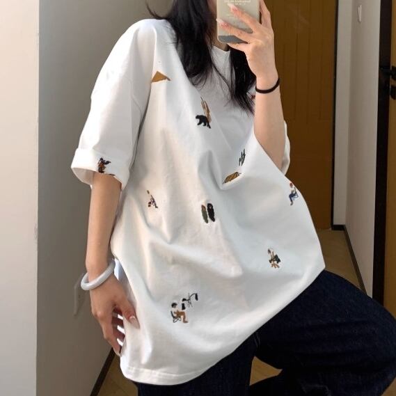 多彩なモチーフがちりばめられた刺繍が目を引くレトロポップなTシャツ。オーバーサイズ&コットン素材で着心地は抜群、ストリートにもカジュアルにもマッチ。1枚でコーデがキマる、着るだけで気分が上がるアイテムです。 ◇カラー ホワイト ブラック ◇素材 コットン ◇サイズ:M,L,XL,2XL M 肩幅:58cm 胸囲:120cm 着丈:70cm 袖丈:24cm L 肩幅:59cm 胸囲:124cm 着丈:72cm 袖丈:24.5cm XL 肩幅:60cm 胸囲:128cm 着丈:74cm 袖丈:25cm 2XL 肩幅:61cm 胸囲:132cm 着丈:76cm 袖丈:25.5cm ◇モデル 身長158cm:Mサイズ着用