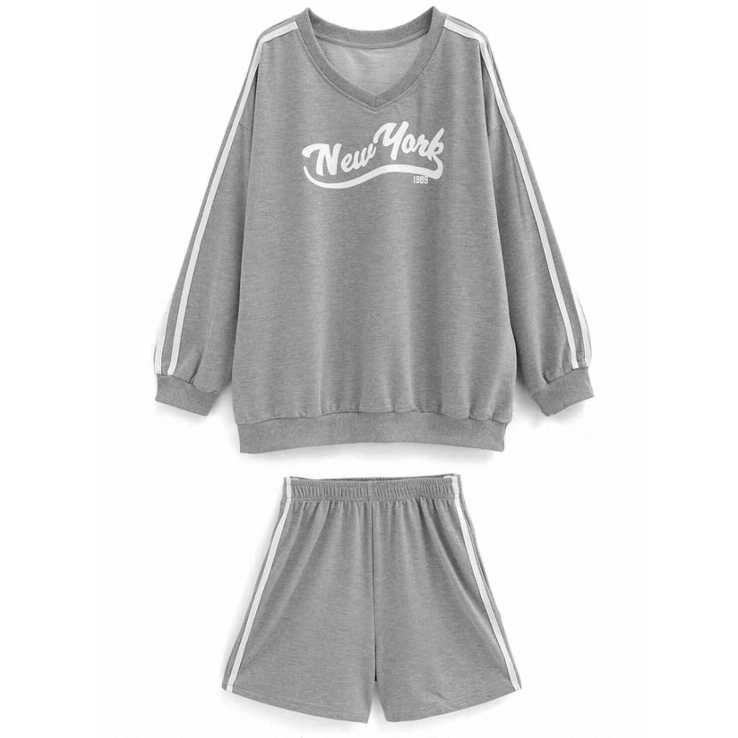 Vネックのレタープリントトップスとルーズなショートパンツの組み合わせで、リラックス感とおしゃれ感を両立しました。