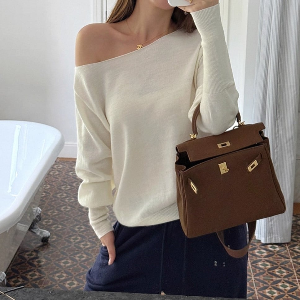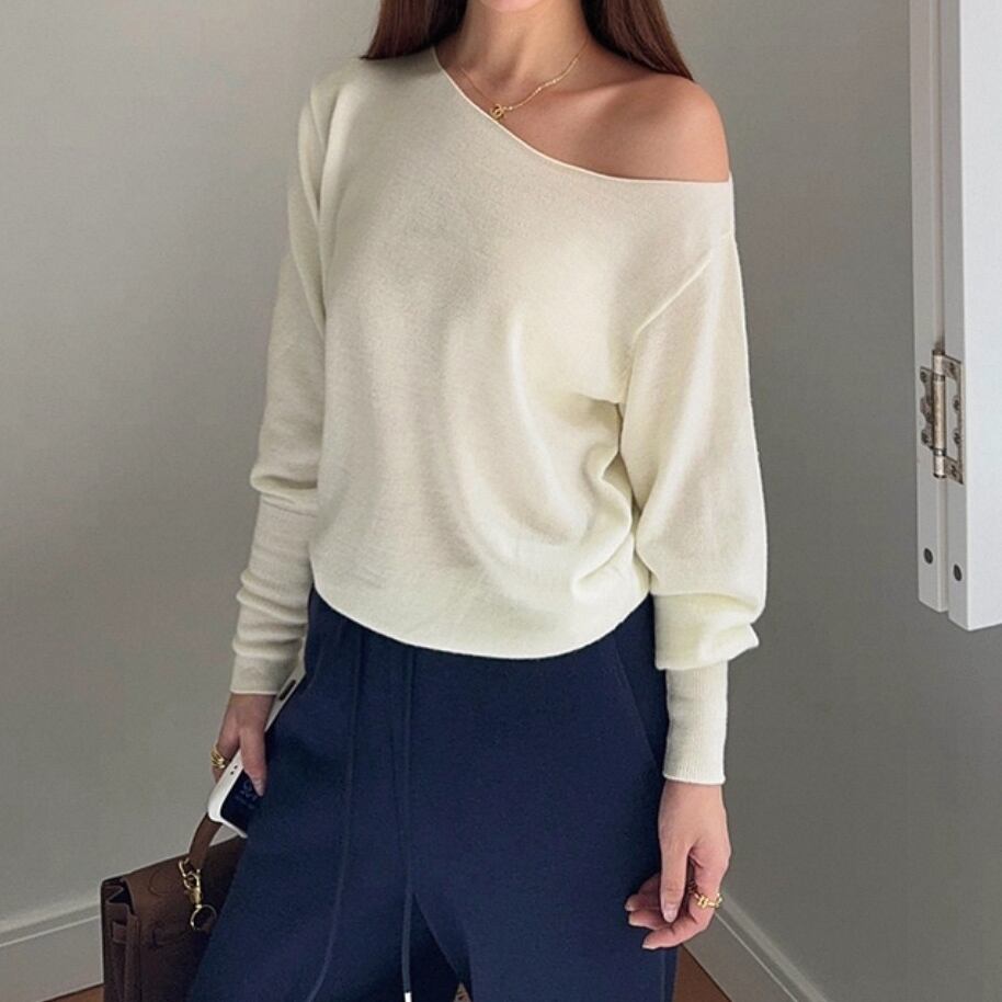 一枚でおしゃれ度が高まる、斜め襟オフショルダートップス。肩ラインをまっすぐ描き、デコルテを美しく魅せるデザインがポイント。シンプルながら体型をさりげなくカバーできるので、パンツにもスカートにも合わせやすく、幅広いシーンで活躍します。 ◇カラー オフホワイト ブラック レッド ◇素材 アクリル ウール ◇サイズ:S,M,L S 肩幅:41cm胸囲:101cm着丈:55cm 袖丈:59cm M 肩幅:42cm胸囲:105cm着丈:56.5cm 袖丈:60cm L 肩幅:43cm胸囲:109cm着丈:58cm 袖丈:61cm ◇モデル 身長163cm:Sサイズ着用