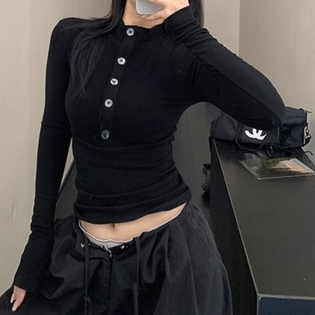 スタイリッシュなショート丈&ハーフハイカラーがポイントの長袖シャツ。