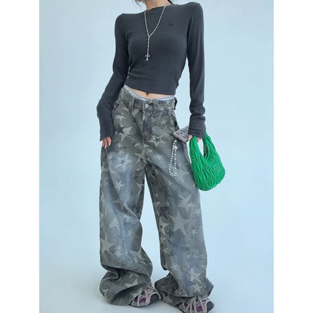 アメリカンレトロな雰囲気が漂う、五芒星柄のダメージ加工ジーンズ。ゆったりとしたストレートワイドレッグシルエットで、抜け感のあるカジュアルスタイルを演出。1枚でトレンド感たっぷりのコーデが完成する主役級パンツです。