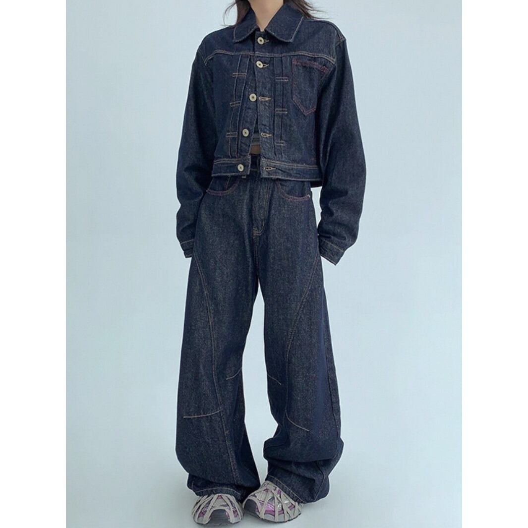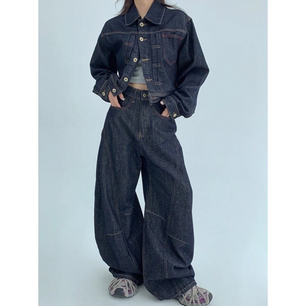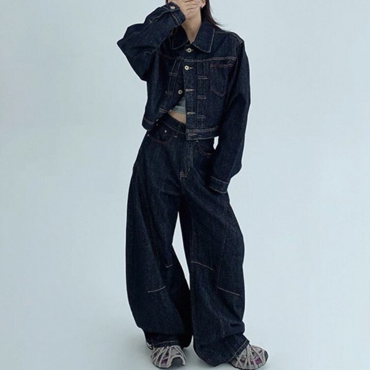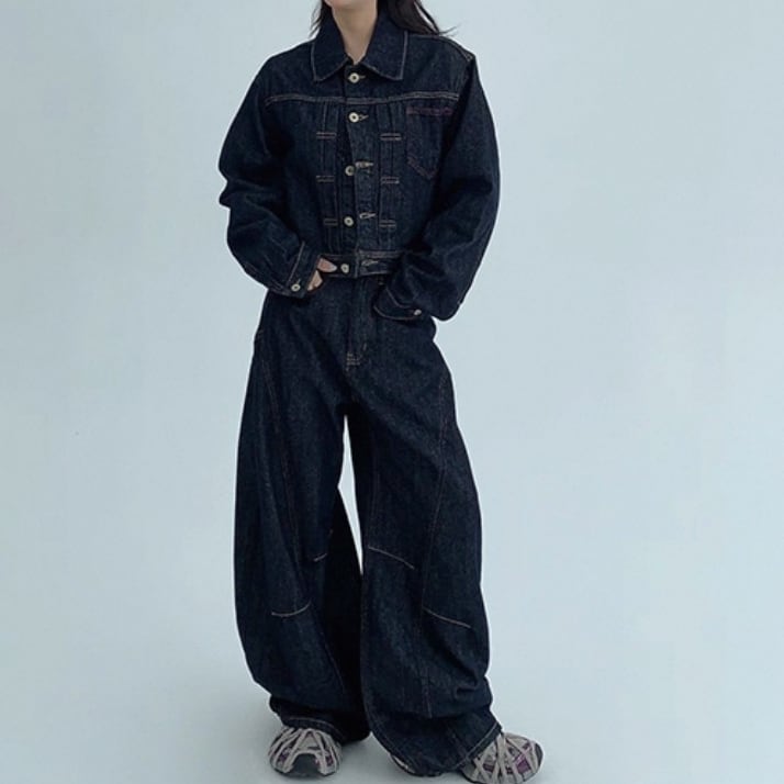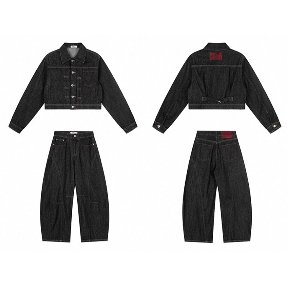 ラフさと上品さを兼ね備えた、レトロ感たっぷりのショートデニムジャケット。 ゆるめのシルエットが体のラインを拾わず、抜け感のあるスタイルに。 セットのデニムパンツと合わせて、トータルで統一感のある大人カジュアルに。 ◇カラー ブラック ◇素材 ウォッシュドデニムコットン ◇サイズ:XS,S,M,L,XL トップス S 肩幅:46.5cm胸囲:108cm着丈:47.5cm 袖丈:60.5cm M 肩幅:48.5cm胸囲:112cm着丈:48.5cm 袖丈:61.5cm L 肩幅50.5cm胸囲:116cm着丈:49.5cm 袖丈:62.5cm パンツ XS ウエスト:63cm ヒップ:106cm パンツ丈:105cm S ウエスト:67cm ヒップ:110cm パンツ丈:106cm M ウエスト:71cm ヒップ:114cm パンツ丈:107cm L ウエスト:75cm ヒップ:118cm パンツ丈:108cm XL ウエスト:79cm ヒップ:122cm パンツ丈:109cm ◇モデル 身長158cm:トップスSサイズ着用 パンツXSサイズ着用