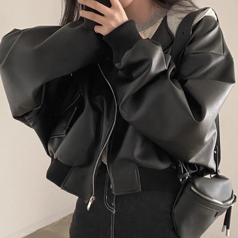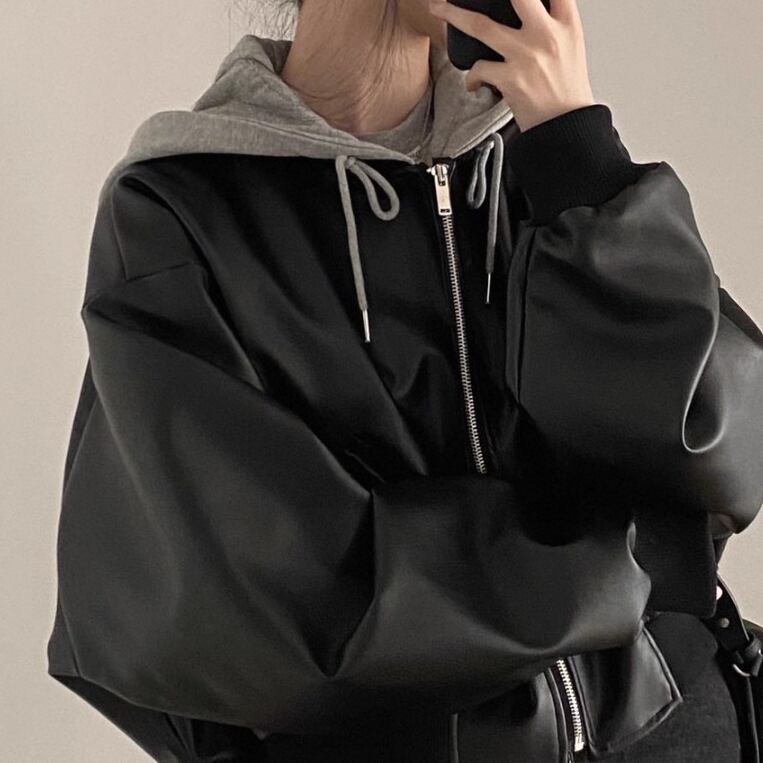 フード付きでカジュアルさをプラスしつつ、PUレザーの質感が大人のクールさを演出。