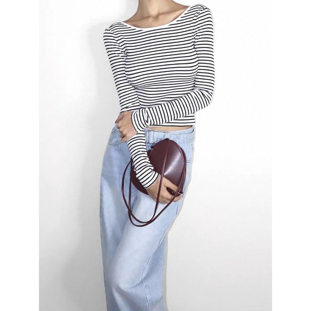 背中のオープンデザインが視線を惹きつける、ストライプ柄のクロップドトップス。