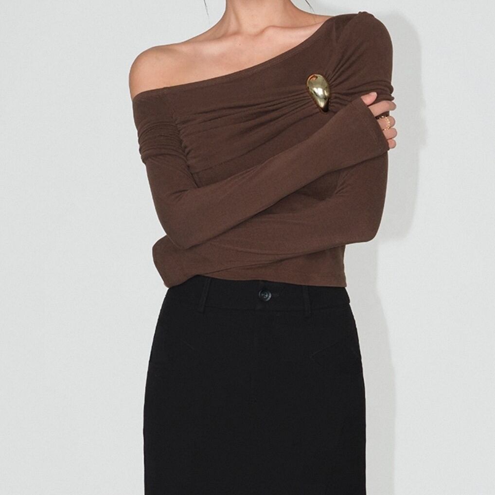 イレギュラーなオフショルダーデザインが、さりげなく女性らしさを引き立てるロングスリーブTシャツ。スリムフィットで美しいシルエットを演出し、1枚でもインナーでも活躍。エレガントさと抜け感を兼ね備えた万能トップスです。 ◇カラー ホワイト ブラウン ◇素材 ビスコース アクリル ◇サイズ:S,M,L,XL S 胸囲:72cm着丈:46cm 袖丈:左59/右51cm M 胸囲:76cm着丈:47.5cm 袖丈:左60/右51.7cm L 胸囲:80cm着丈:49cm 袖丈:左61/右52.4cm XL 胸囲:84cm着丈:50.5cm 袖丈:左62/右53.1cm ◇モデル 身長173cm:Sサイズ着用