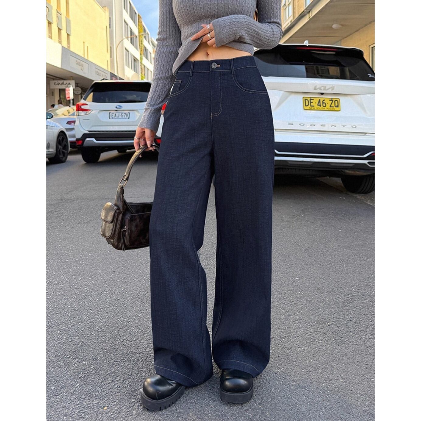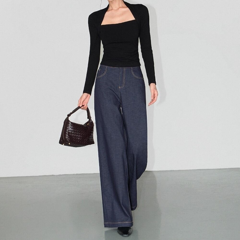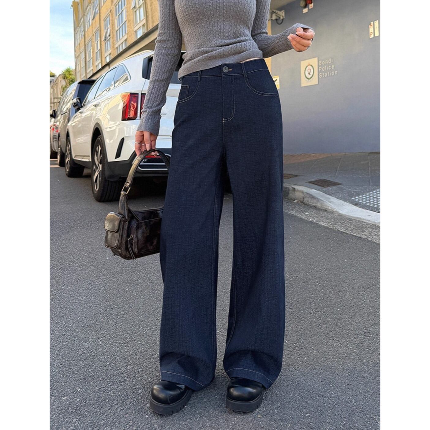 ハイウエストデザインで脚長効果を発揮するデニムストレートワイドパンツ。ダークブルーの深みあるカラーが上品で、カジュアルにもモードにもマッチ。快適なルーズフィットで、オン・オフ問わず活躍する万能アイテムです。
