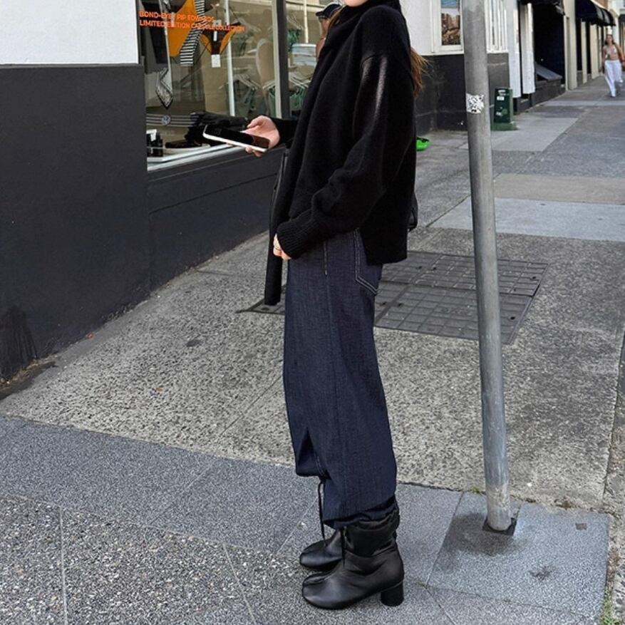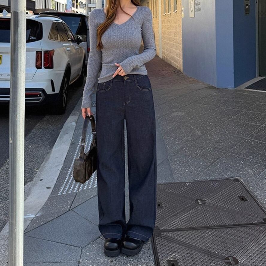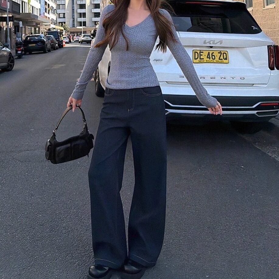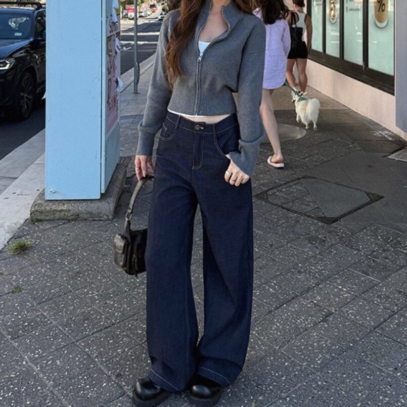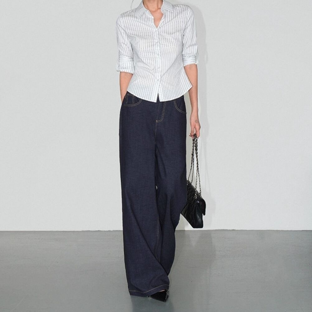 ハイウエストデザインで脚長効果を発揮するデニムストレートワイドパンツ。ダークブルーの深みあるカラーが上品で、カジュアルにもモードにもマッチ。快適なルーズフィットで、オン・オフ問わず活躍する万能アイテムです。