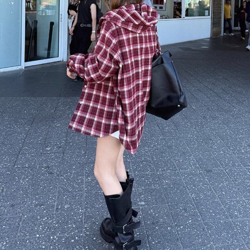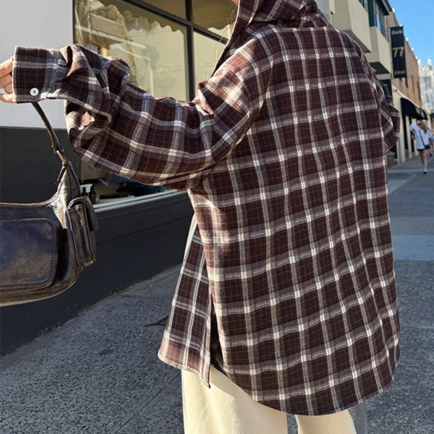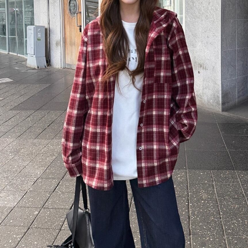 トレンドのレトロチェック柄が魅力のフード付きシャツジャケット。 起毛感のあるブラッシュド素材で、あたたかく着心地も抜群。 ゆったりシルエットでラフに羽織れるから、デイリーコーデやお出かけにもぴったり。 1枚でこなれ感を演出できるカジュアルアウターです。 ◇カラー レッド ブラウン ◇素材 ポリエステル ビスコース ◇サイズ:S,M,L S 肩幅:46.5cm胸囲:124cm着丈:69.5cm 袖丈:58cm M 肩幅:47.5cm胸囲:128cm着丈:71cm 袖丈:59cm L 肩幅:48.5cm胸囲:132cm着丈:72.5cm 袖丈:60cm ◇モデル 身長163cm:Sサイズ着用