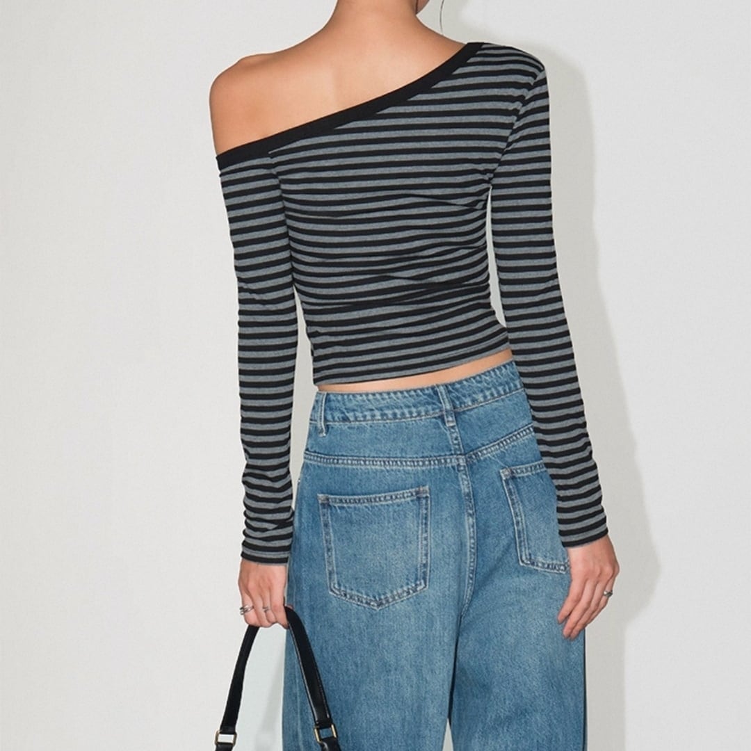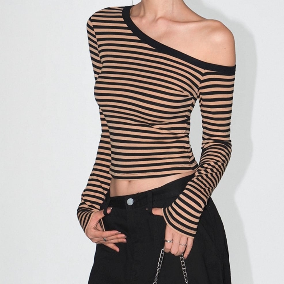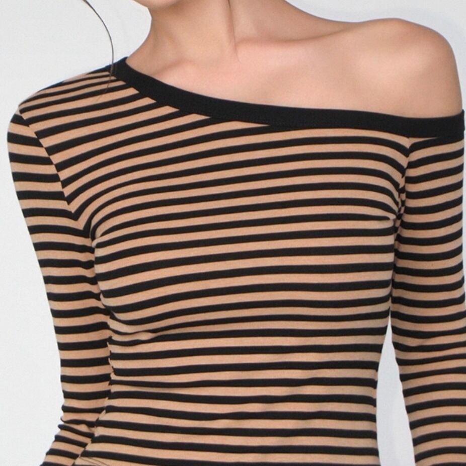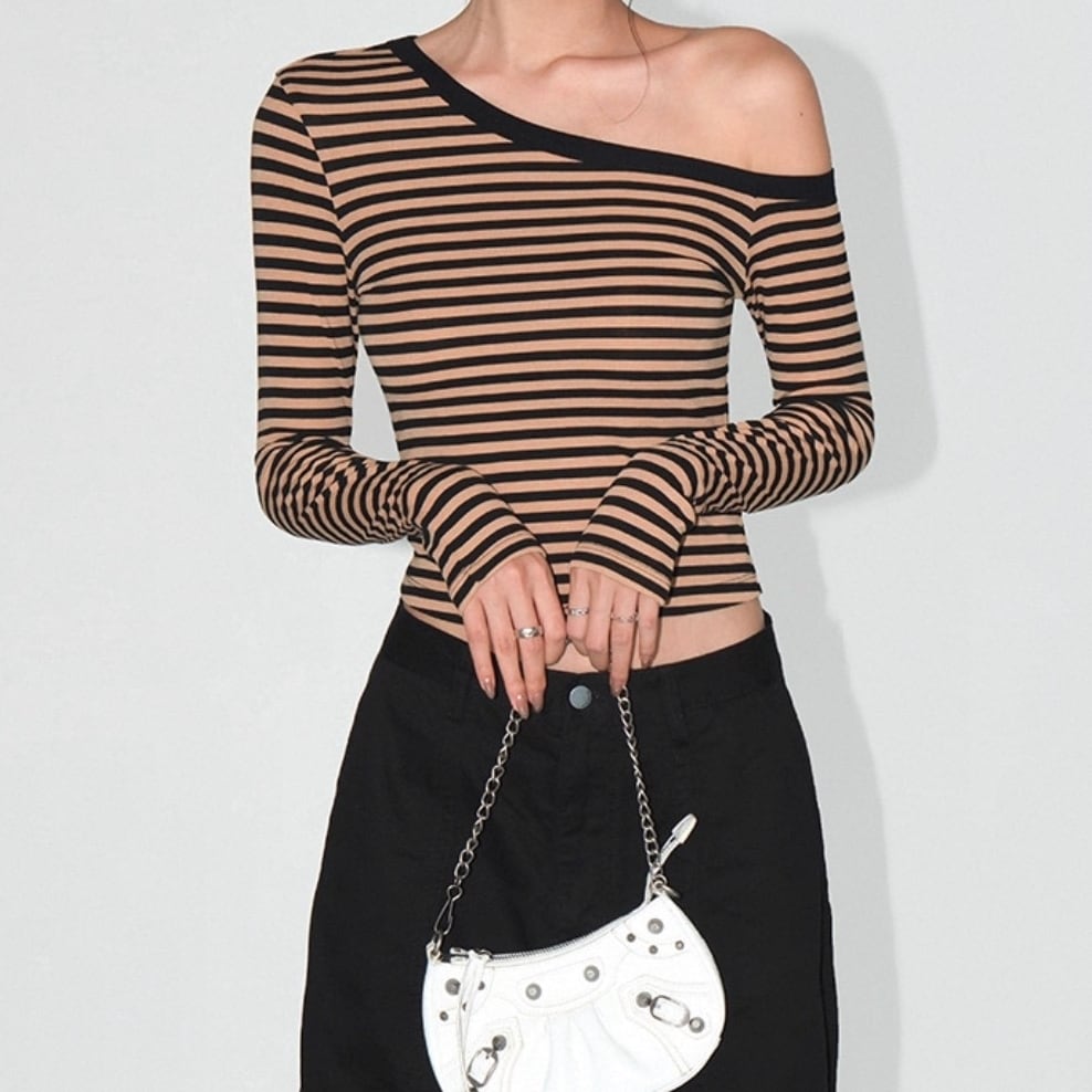 オフショルダーのデザインが洗練された印象を与えるストライプロングスリーブTシャツ。 スリムなフィット感でスマートに着こなせ、インナーとしても一枚でも決まるデザイン。 モード感のある大人のベースレイヤーとして、季節問わず活躍します。 ◇カラー ブラック✕グレー ブラック✕ベージュ ◇素材 ポリエステル ビスコース ◇サイズ:S,M,L S 胸囲:70cm着丈:46.5cm 袖丈:左53.5/右58.5cm M 胸囲:74cm着丈:48cm 袖丈:左54.5/右59.5cm L 胸囲:78cm 着丈:49.5cm 袖丈:左55.3/右60.5cm ◇モデル 身長173cm:Sサイズ着用