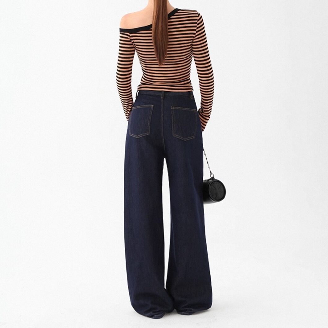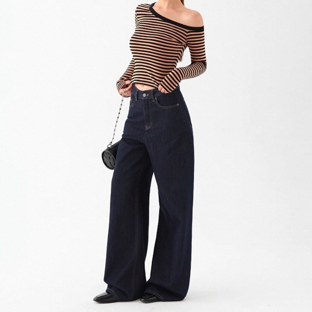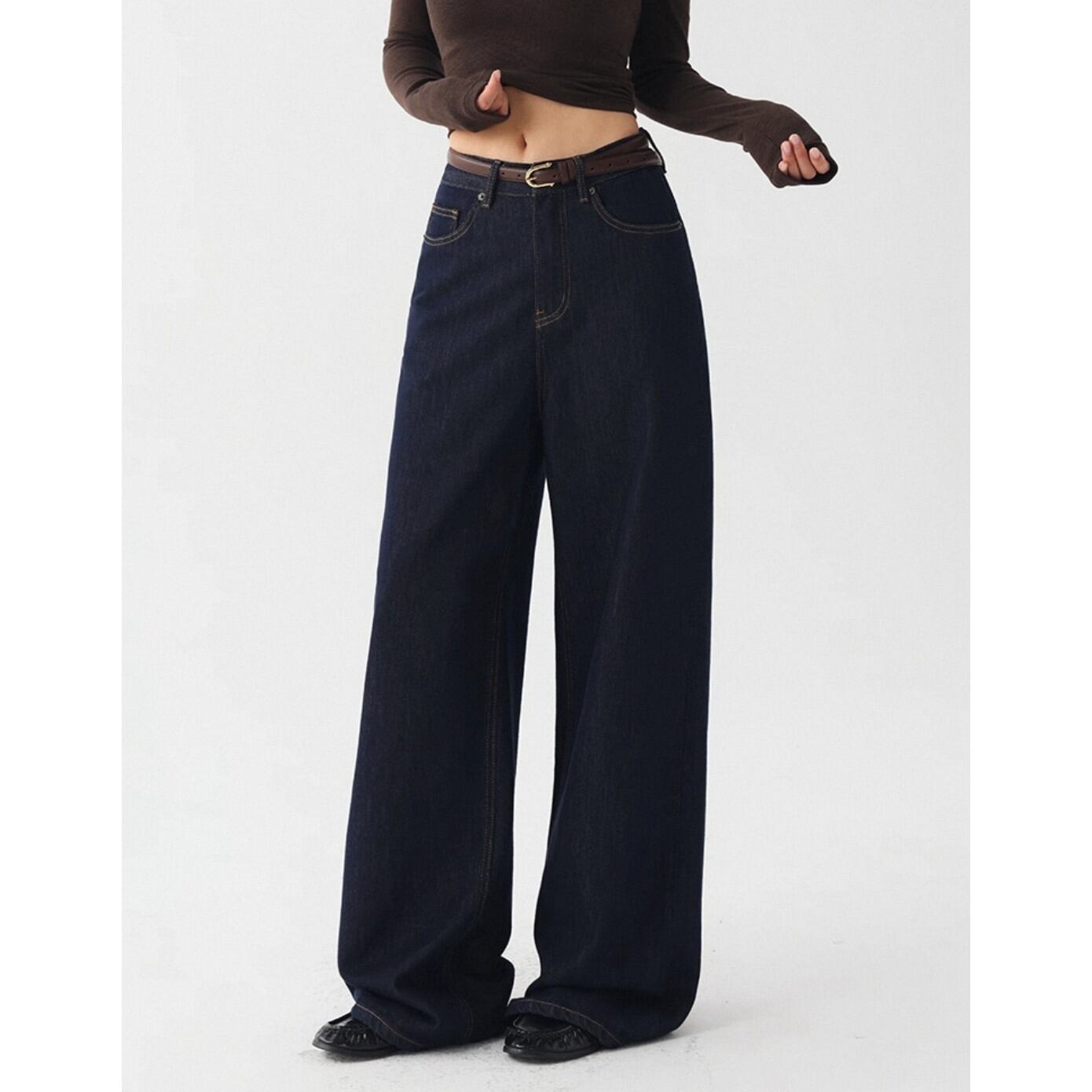 ルーズなストレートシルエットにダークブルーの色味が映え、