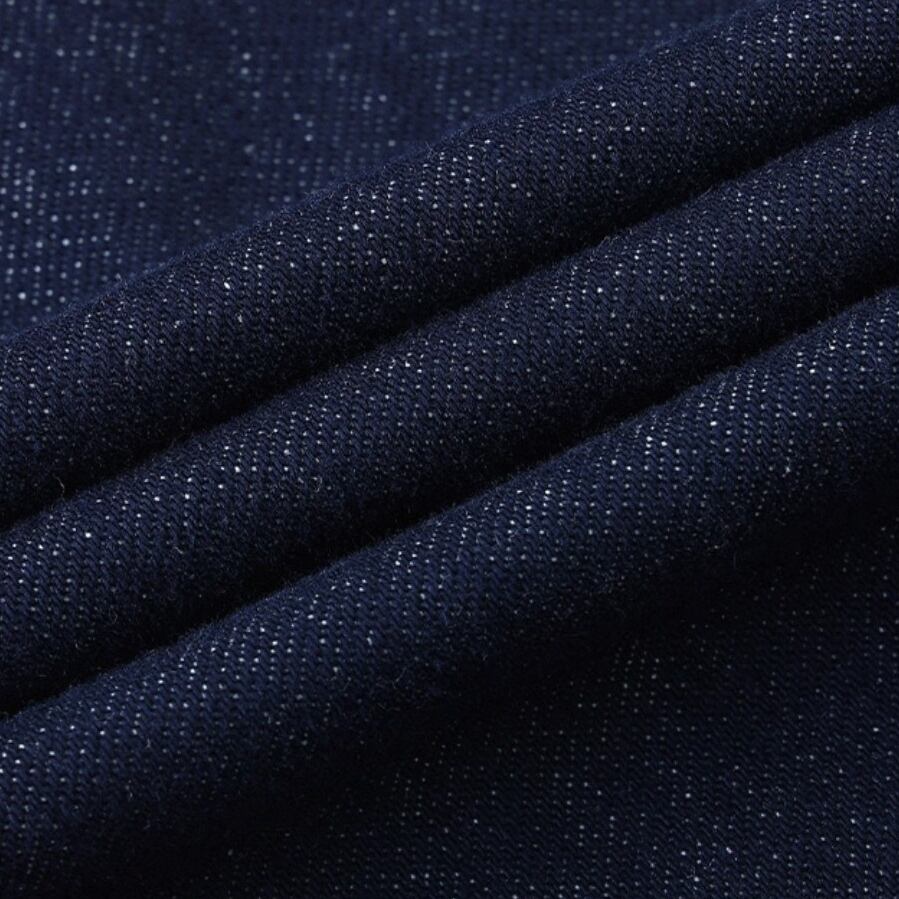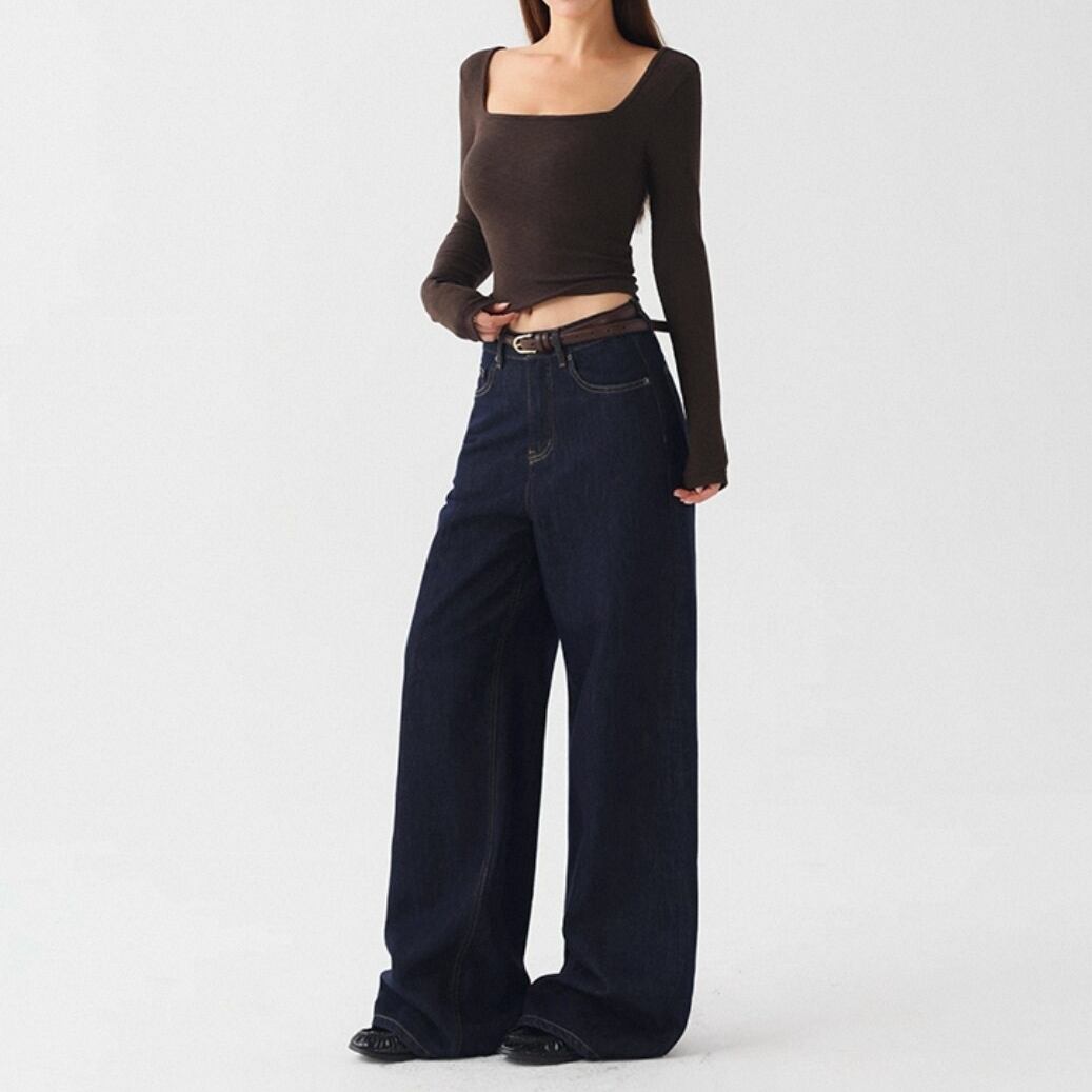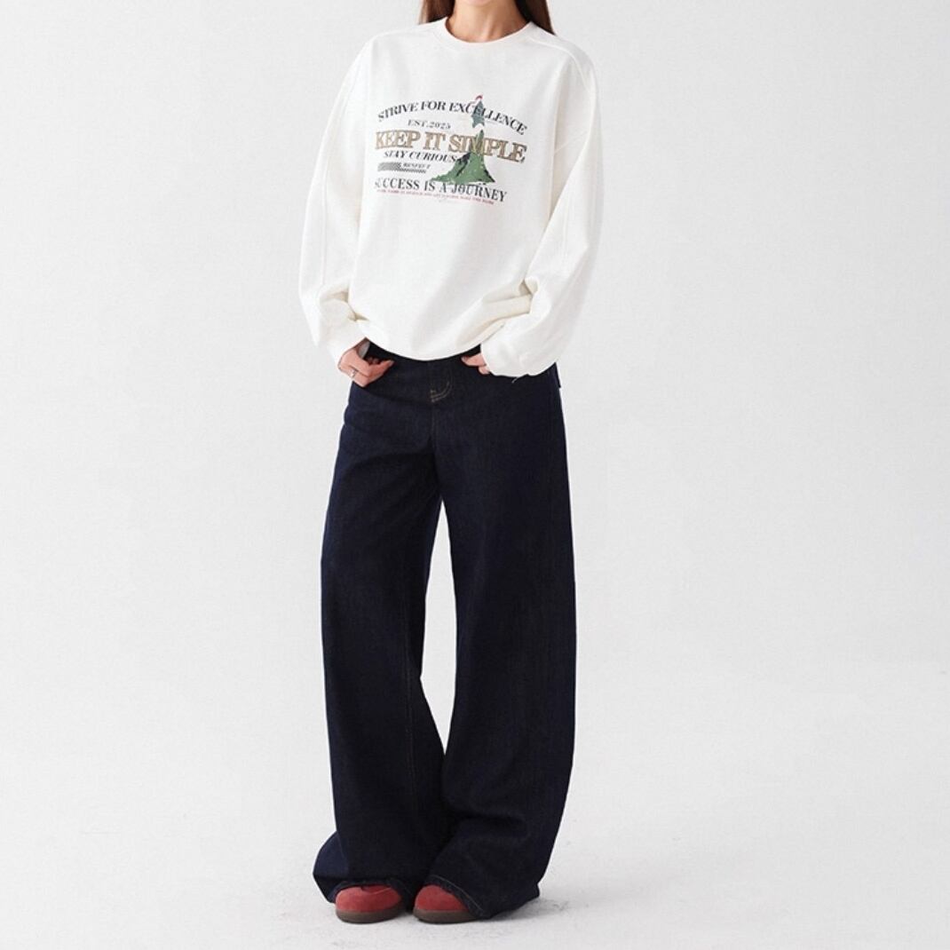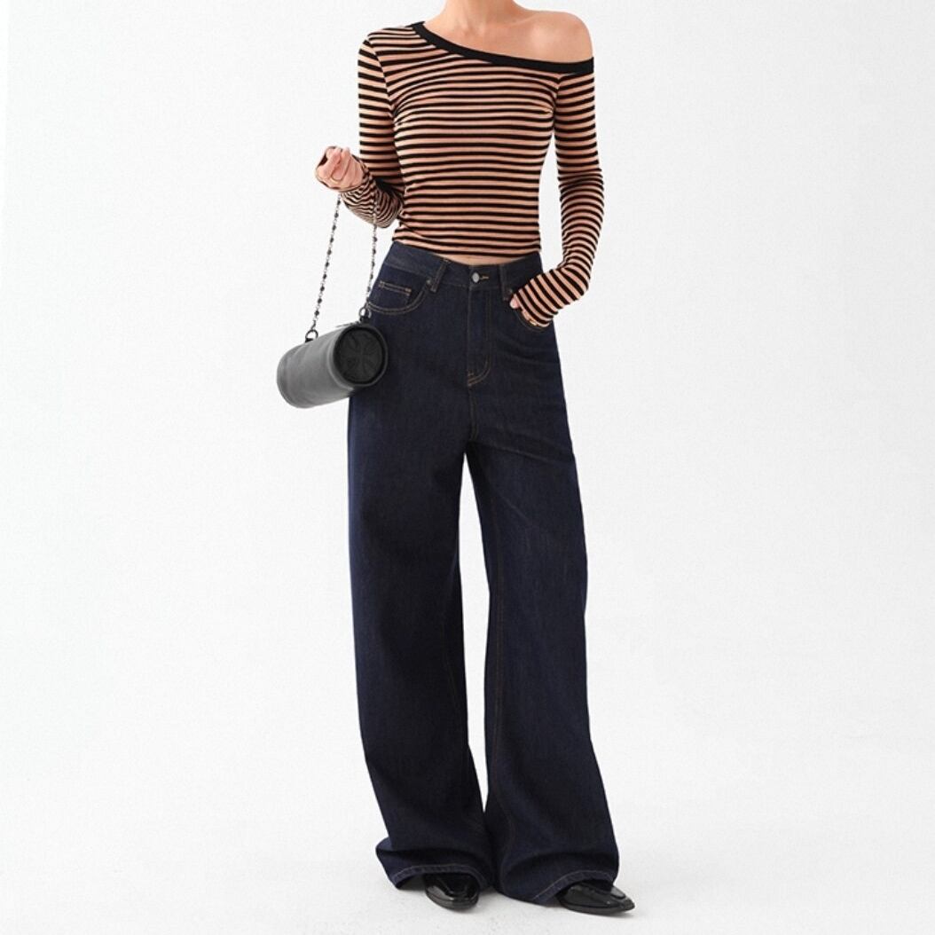 ルーズなストレートシルエットにダークブルーの色味が映え、
