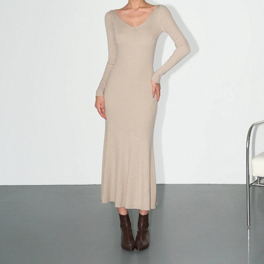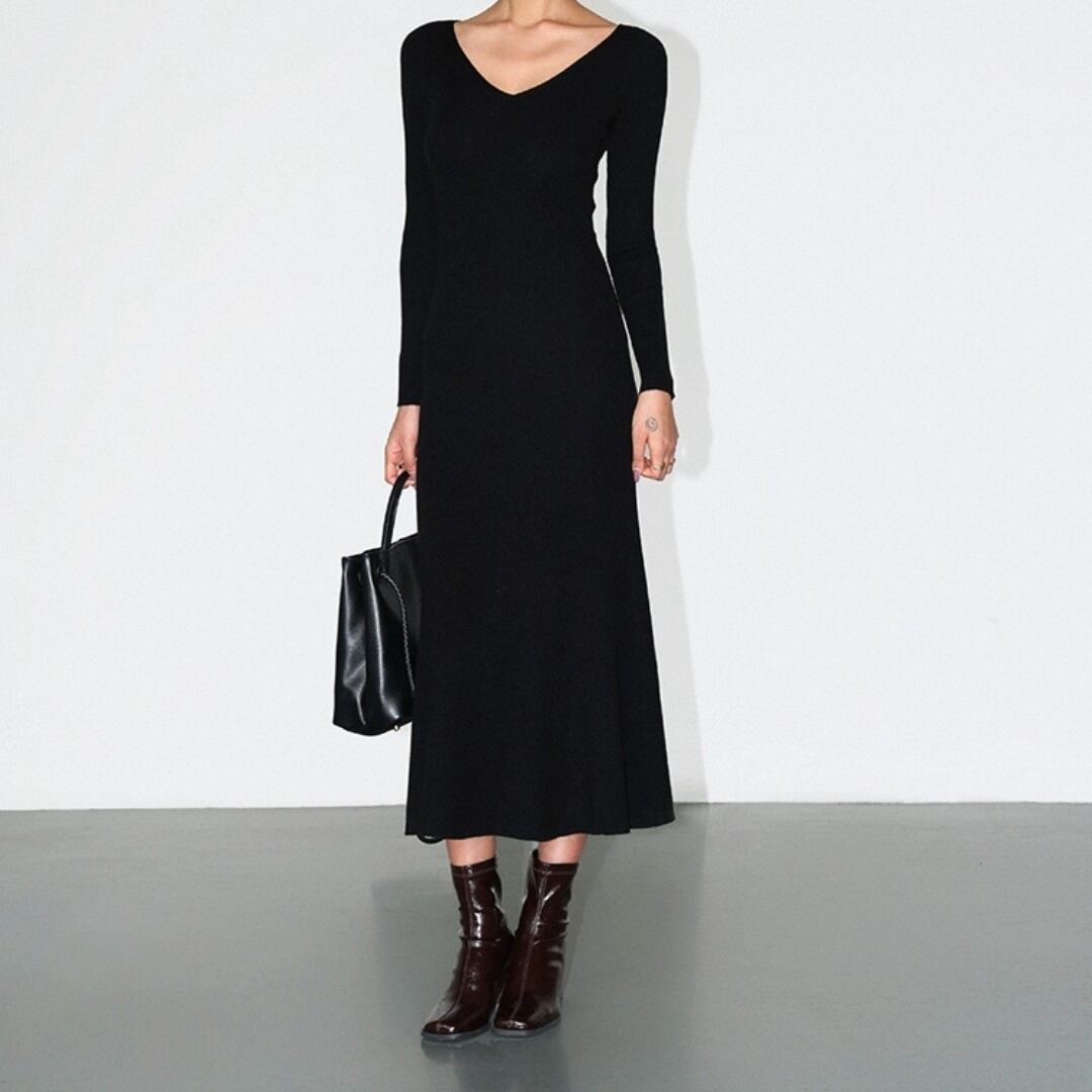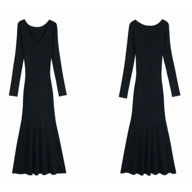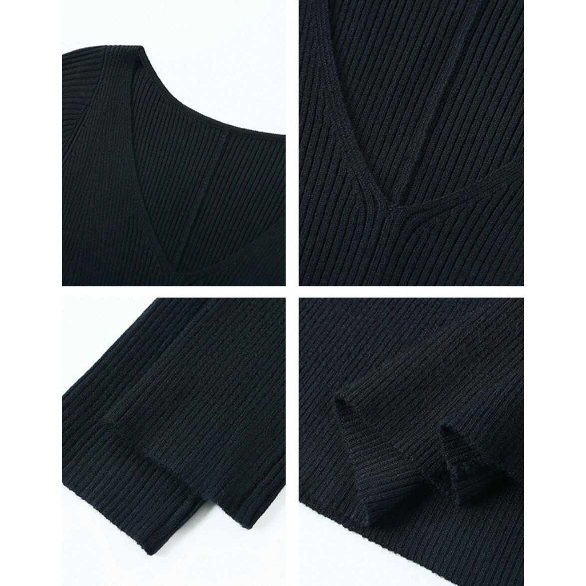上品な雰囲気を漂わせる、エレガントなVネック長袖ニットワンピース。 身体のラインにほどよくフィットするスリムシルエットが、女性らしい曲線を美しく演出します。 デイリーにもお呼ばれにも活躍する、洗練された大人の一枚です。 ◇カラー ブラック グレー ◇素材 リヨセル アクリル ◇サイズ:S,M,L S 肩幅:25cm胸囲:59cm着丈:122.5cm 袖丈:60.5cm M 肩幅:26cm胸囲:63cm着丈:124cm 袖丈:61.5cm L 肩幅:27cm胸囲:67cm着丈:125.5cm 袖丈:62.5cm ◇モデル 身長173cm:Sサイズ着用