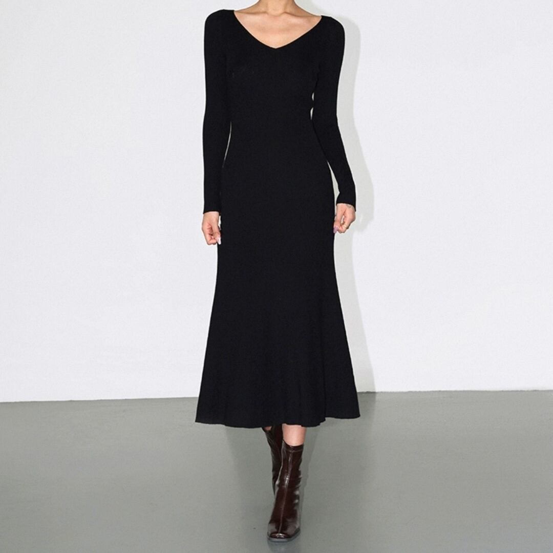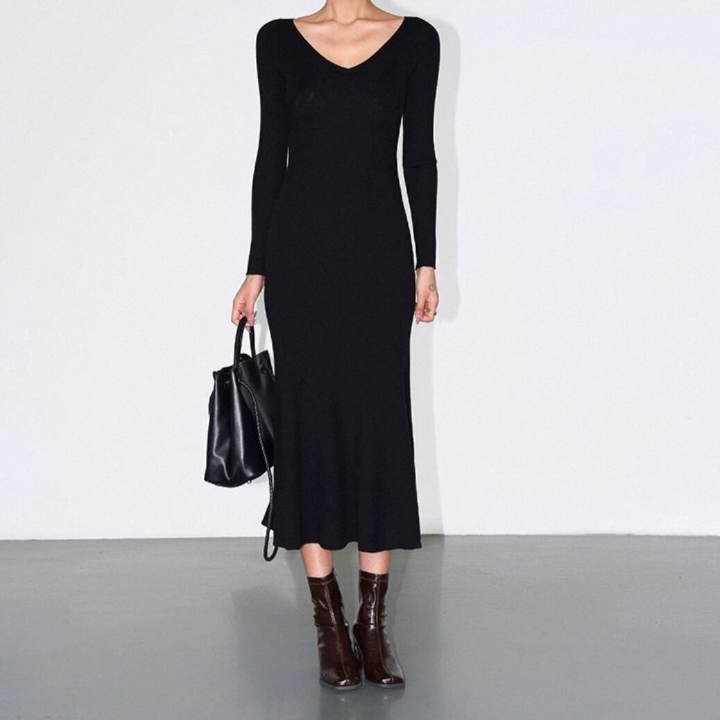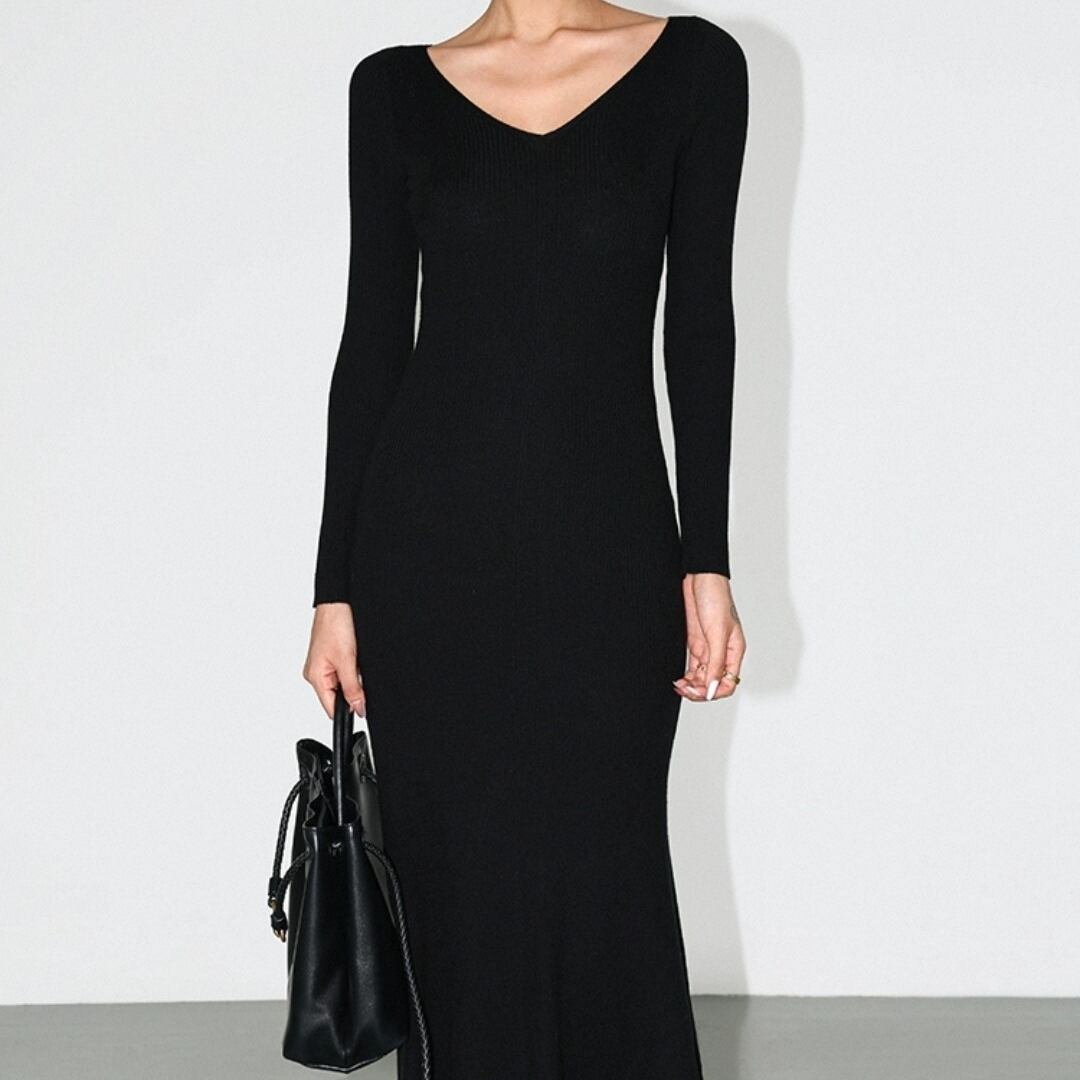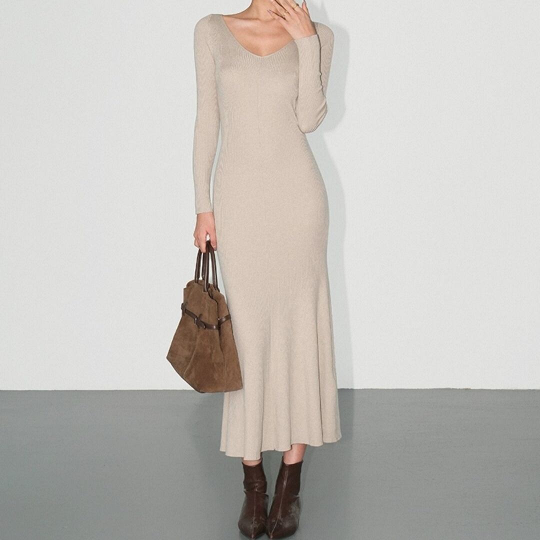 上品な雰囲気を漂わせる、エレガントなVネック長袖ニットワンピース。 身体のラインにほどよくフィットするスリムシルエットが、女性らしい曲線を美しく演出します。 デイリーにもお呼ばれにも活躍する、洗練された大人の一枚です。 ◇カラー ブラック グレー ◇素材 リヨセル アクリル ◇サイズ:S,M,L S 肩幅:25cm胸囲:59cm着丈:122.5cm 袖丈:60.5cm M 肩幅:26cm胸囲:63cm着丈:124cm 袖丈:61.5cm L 肩幅:27cm胸囲:67cm着丈:125.5cm 袖丈:62.5cm ◇モデル 身長173cm:Sサイズ着用