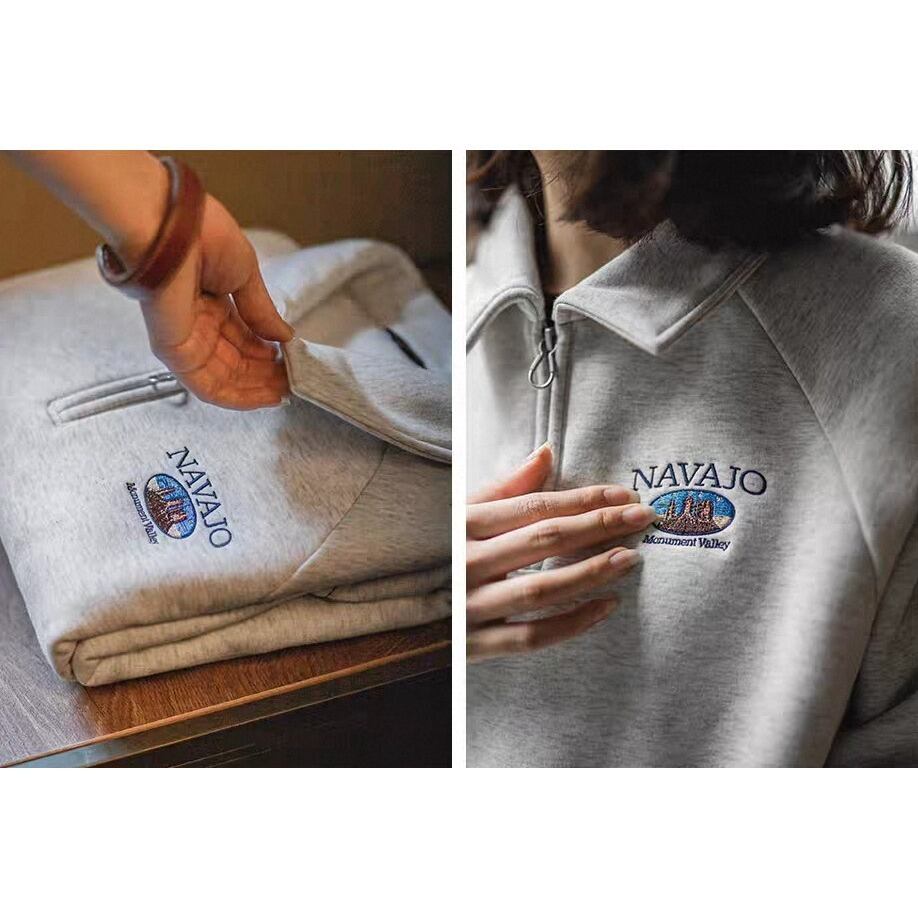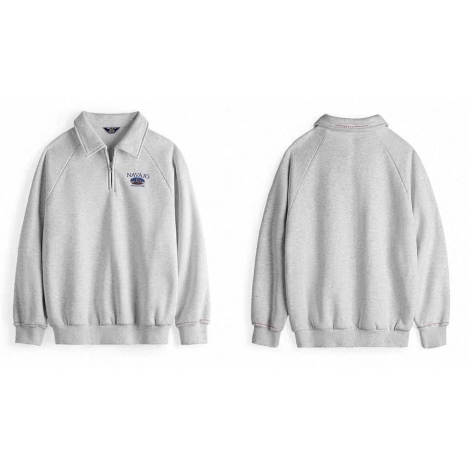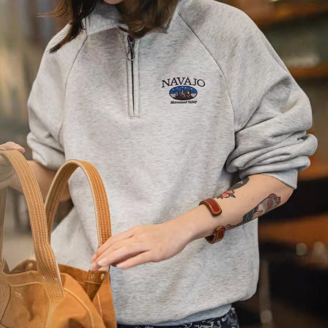 レトログレーが大人カジュアルに映える、ハーフジップタイプのプルオーバースウェット。