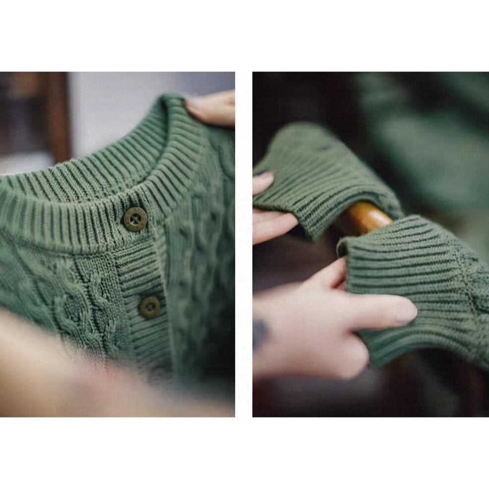 深みのあるレトログリーンが季節感を引き立てる、マッデンの厚手ケーブルニットプルオーバー。