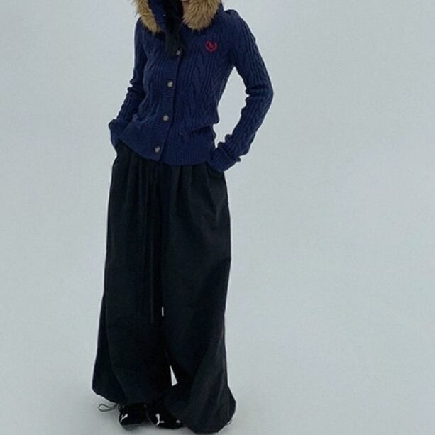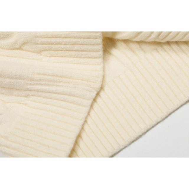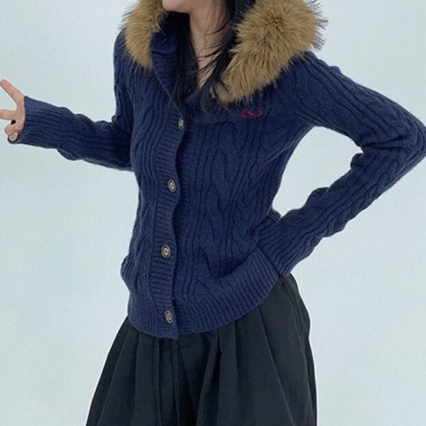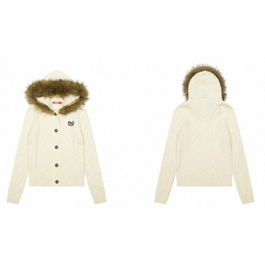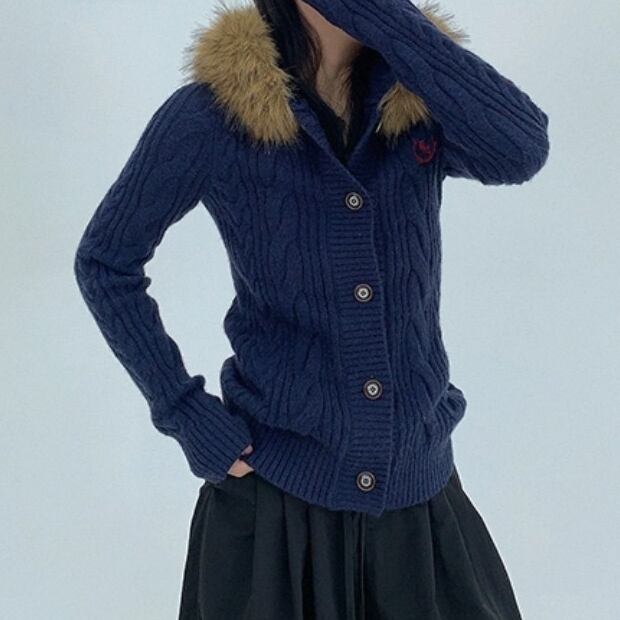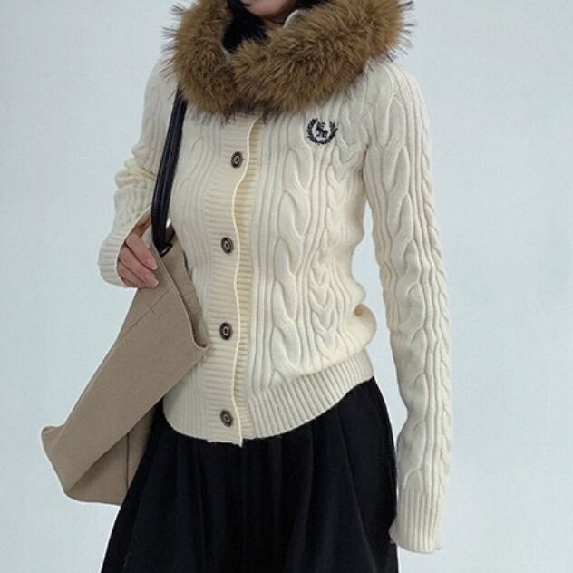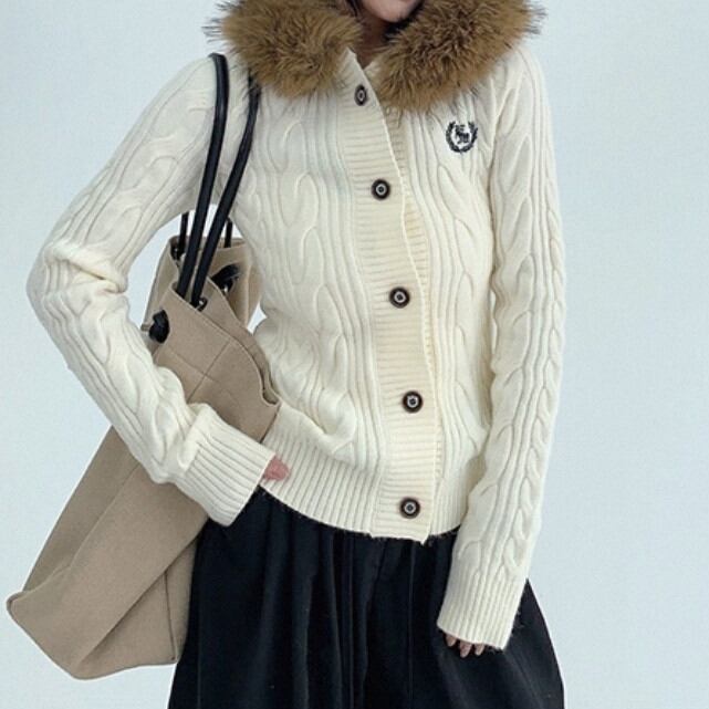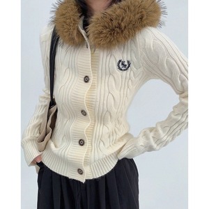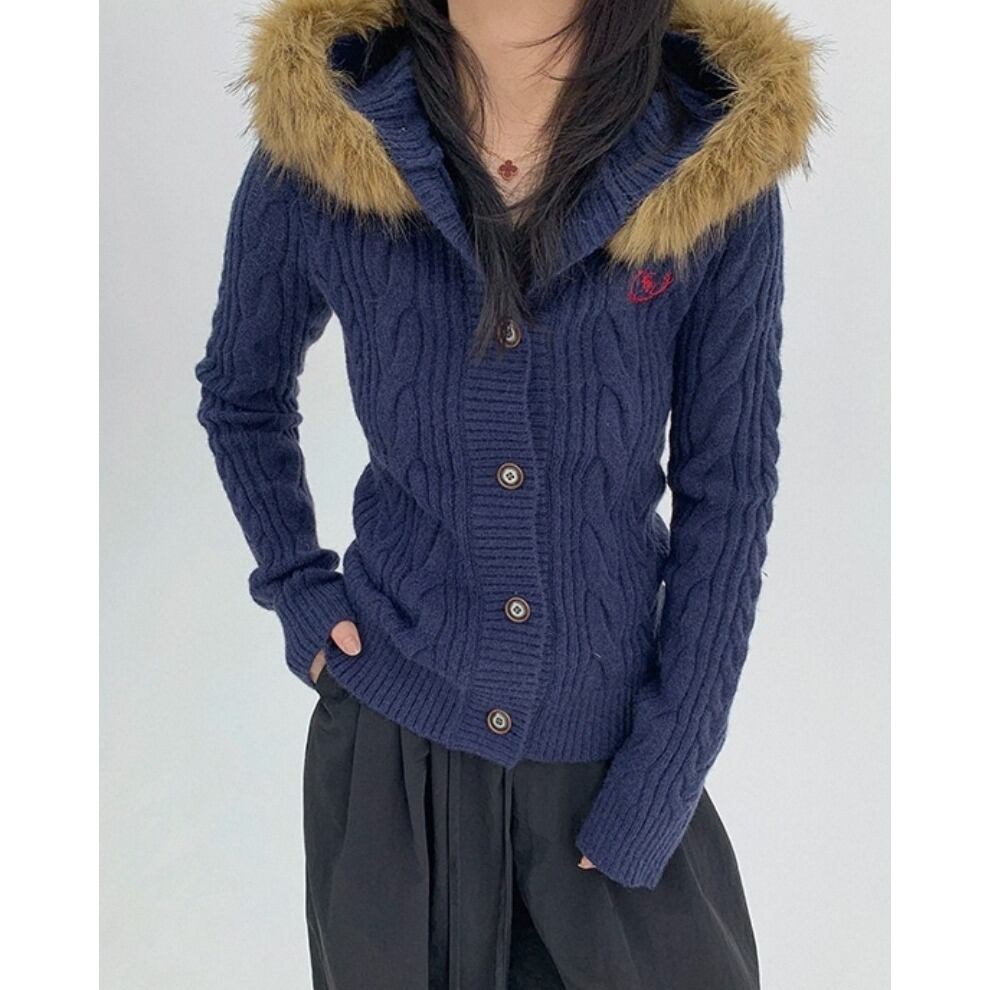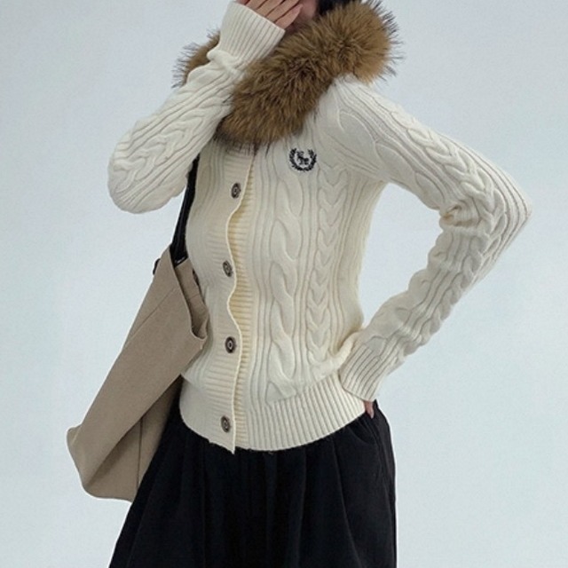 立体感のあるケーブル編みが映える、ショート丈の厚手ニットカーディガン。 フード付きデザインに、上品なファーカラーを組み合わせたレトロハイエンド仕様。 しっかり暖かく、冬のコーデを一気に格上げします。 羽織るだけで存在感のある、大人女性のための一枚です。 ◇カラー オフホワイト ネイビー ◇素材 ポリエステル ◇サイズ:S,M,L S 肩幅:31.5cm胸囲:68cm着丈:56cm 袖丈:64cm M 肩幅:33.5cm胸囲:72cm着丈:58cm 袖丈:66cm L 肩幅:35.5cm胸囲:76cm着丈:60cm 袖丈:68cm ◇モデル 身長158cm:Sサイズ着用
