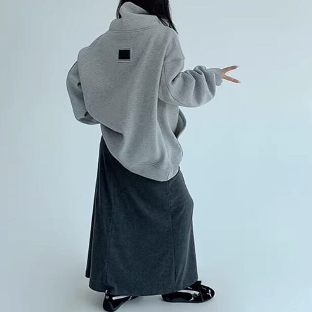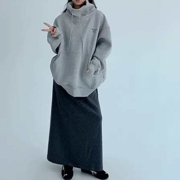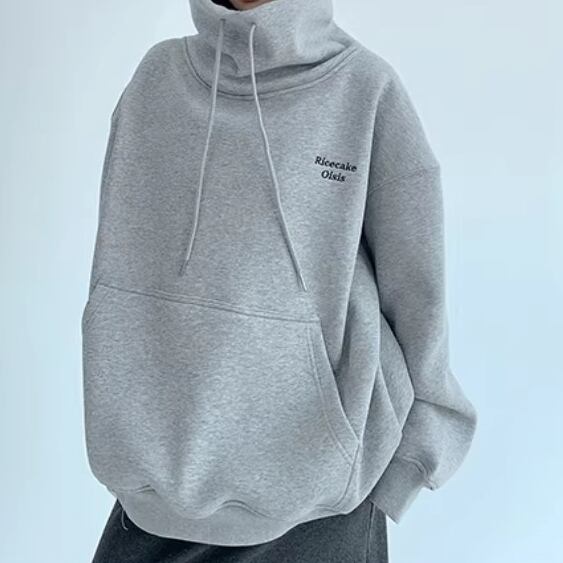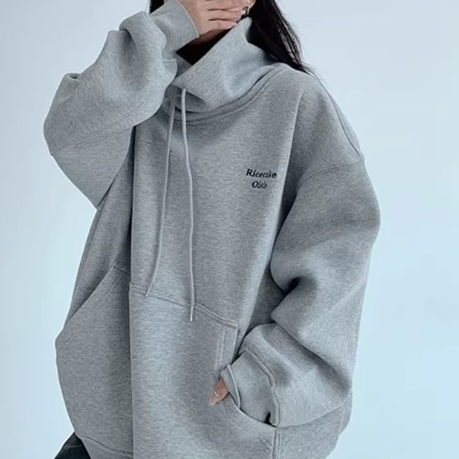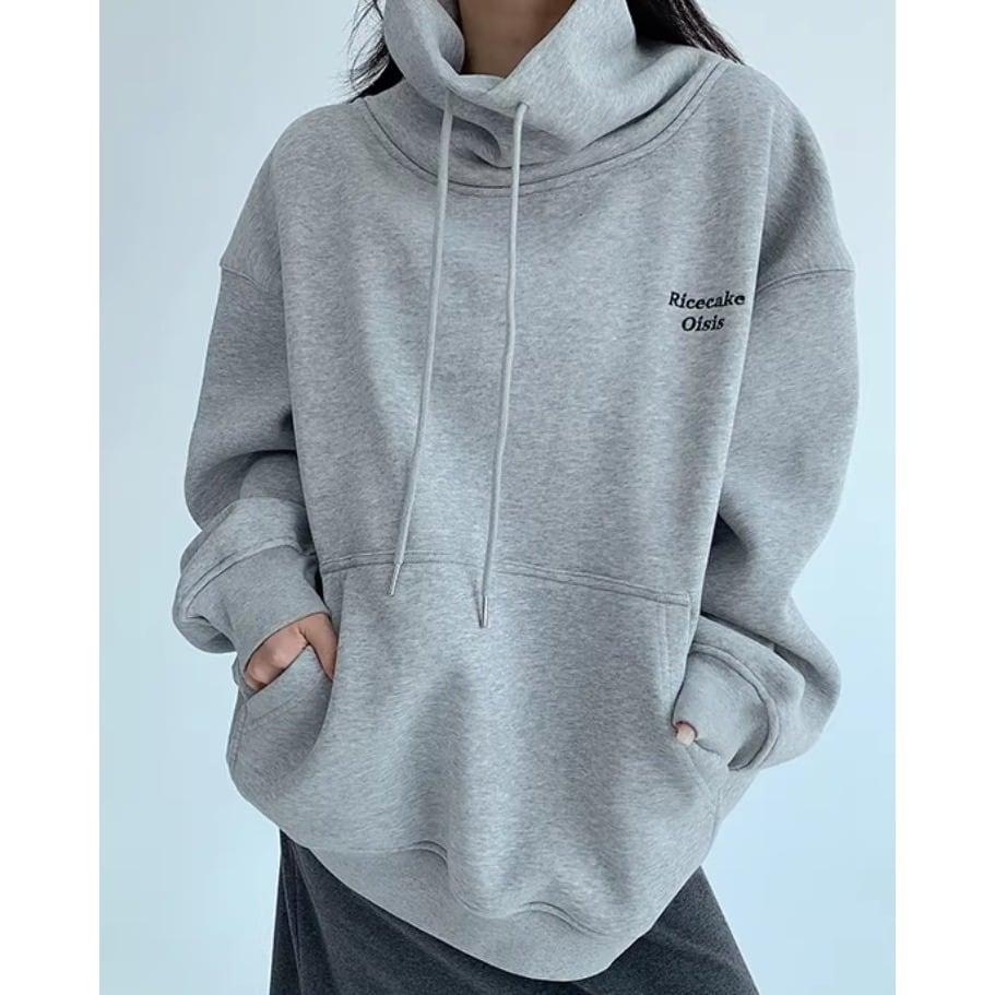 ゆったりとした冬スタイルに映える、刺繍入りハイネックフリーススウェット。