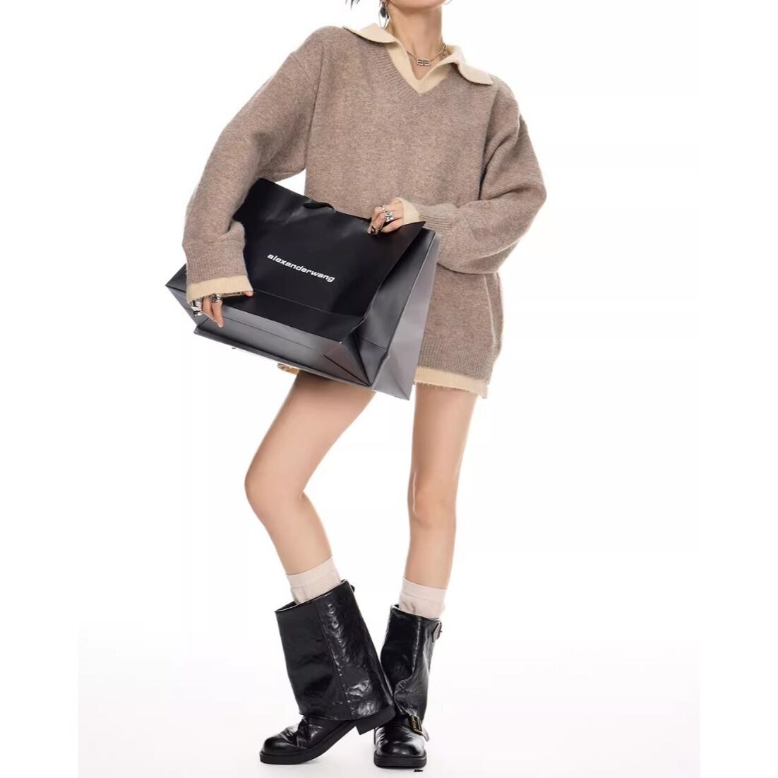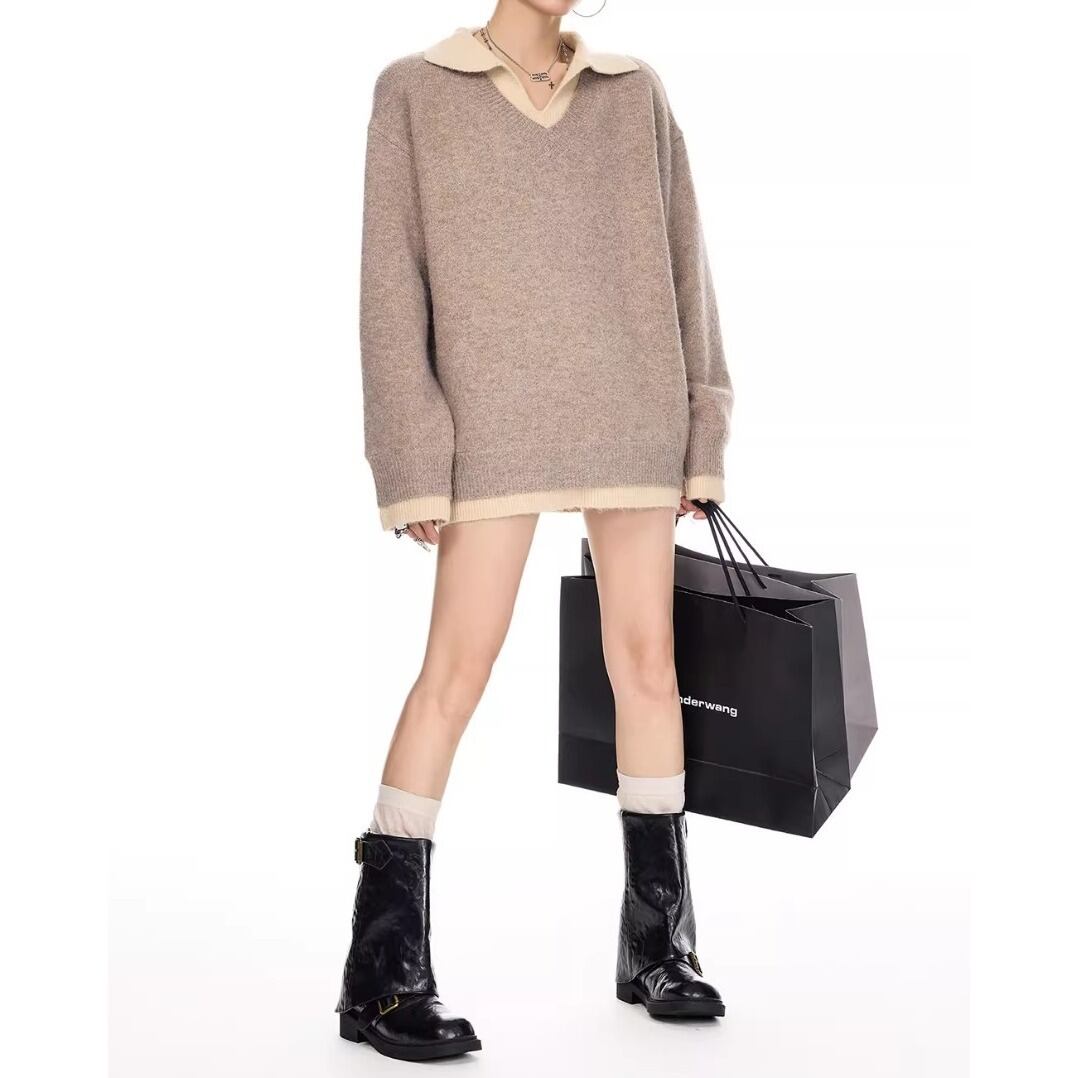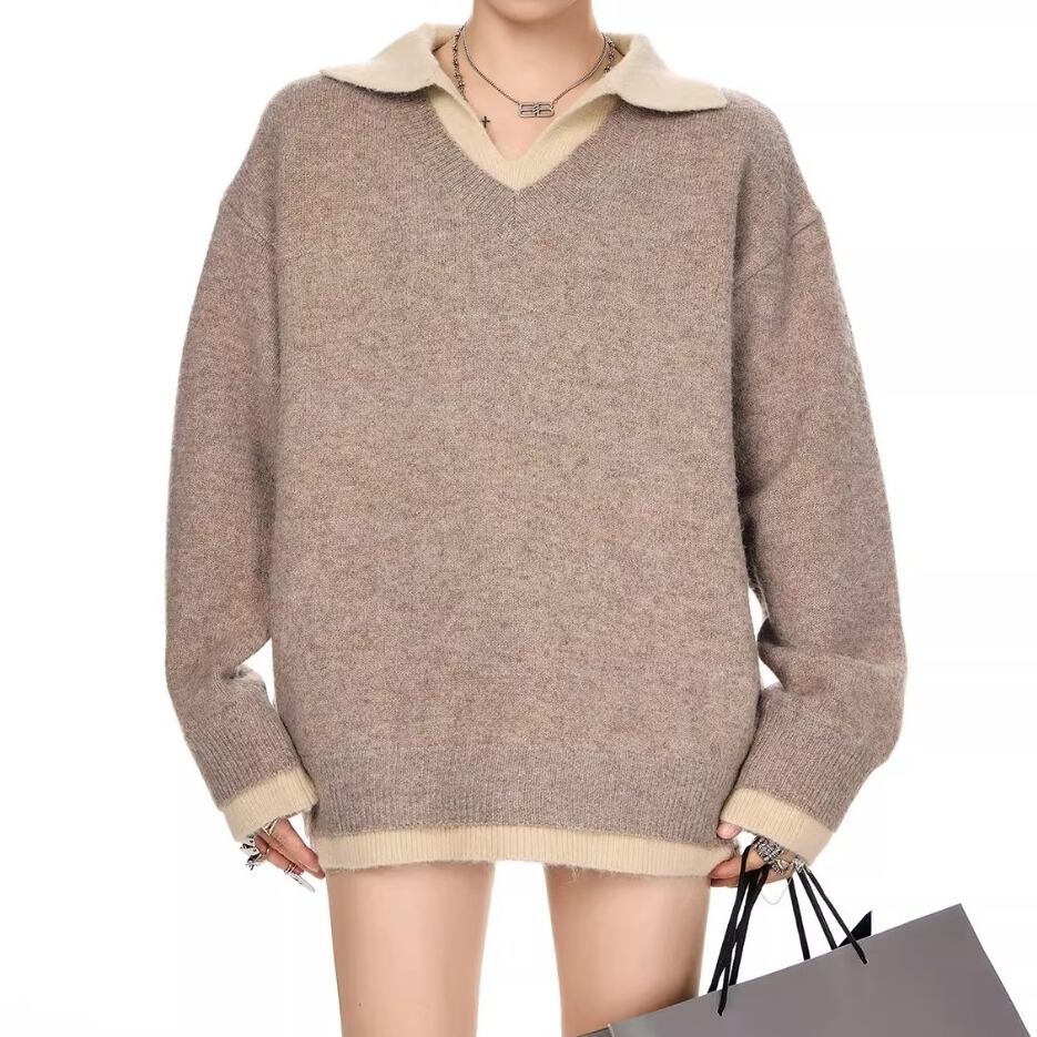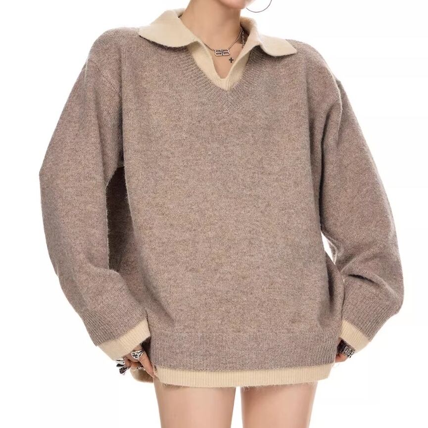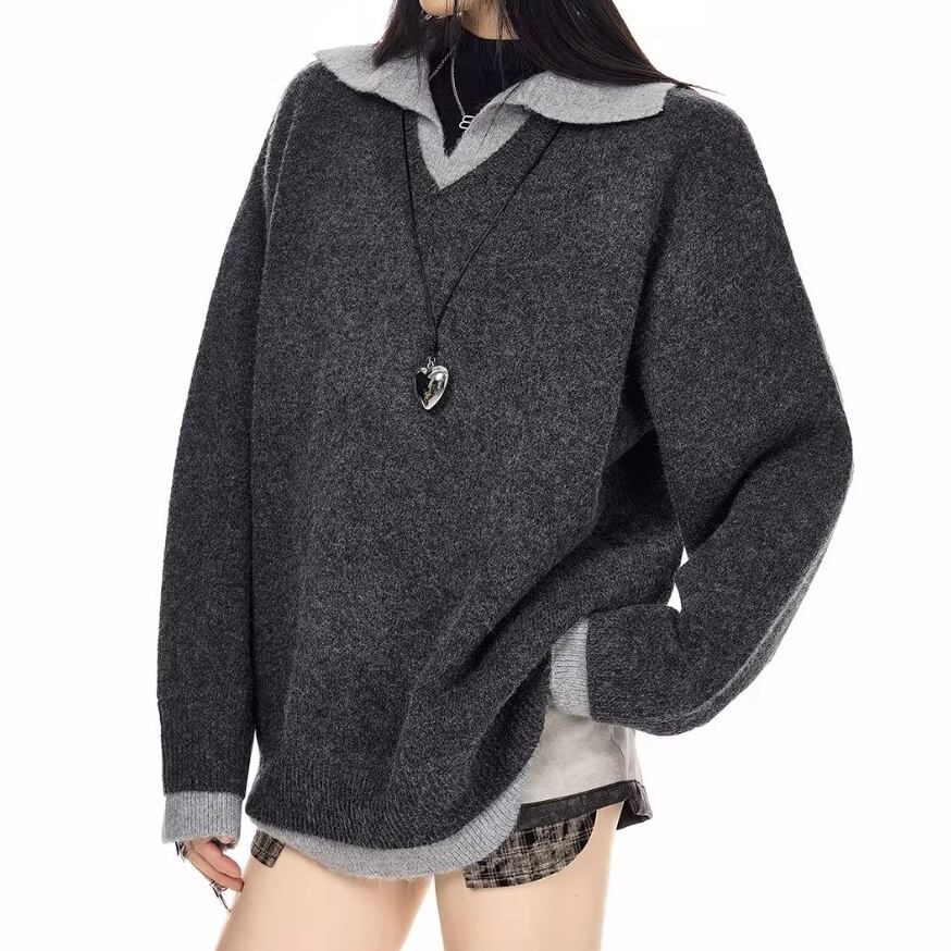 アメリカンスタイルを感じさせる、カラーブロックデザインのVネックセーター。 ラペル付きフェイクツーピース仕様で、重ね着風のこなれた印象に。 リラックス感のあるシルエットで、春秋に心地よく着用可能。 デイリーコーデに活躍する一着です。 ◇カラー カーキ グレー ◇素材 コットン ナイロン ◇サイズ:M,L,XL,2XL M 肩幅:48cm胸囲:112cm着丈:63cm 袖丈:53cm L 肩幅:50cm胸囲:116cm着丈:65cm袖丈:54cm XL 肩幅:52cm胸囲:120cm着丈:67cm袖丈:55cm 2XL 肩幅:54cm胸囲:124cm着丈:69cm袖丈:56cm