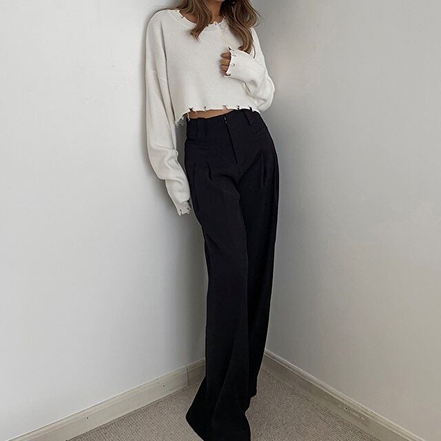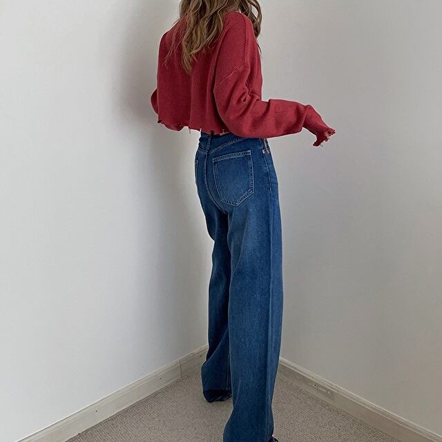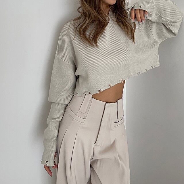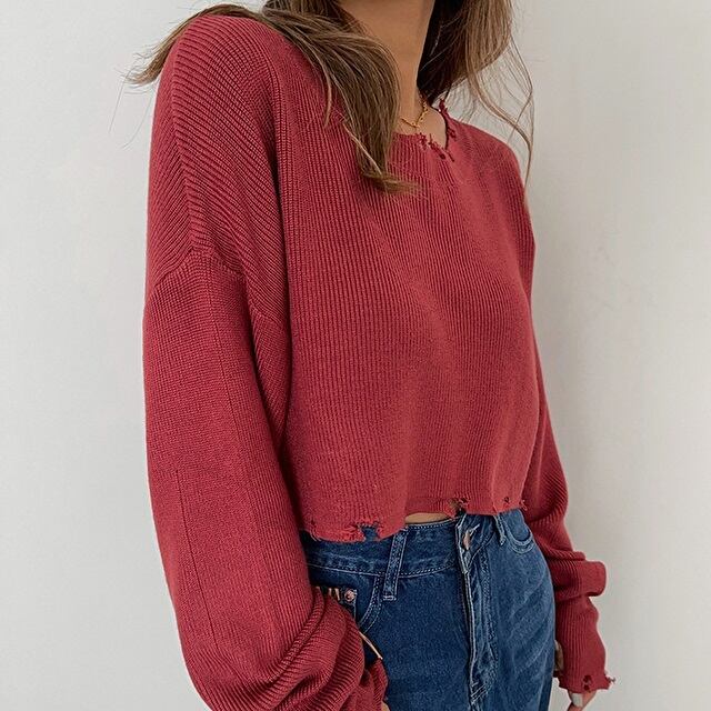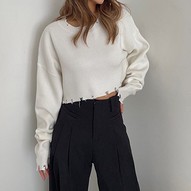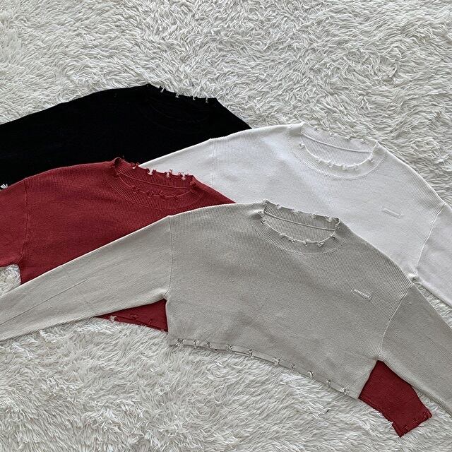 着丈の短いクロップド丈の長袖ニット。 裾のダメージ加工もオシャレ! ハイウエストなボトムスにピッタリです♪ ◇カラー ホワイト ブラック レッド ライトベージュ ◇サイズ:S,M S 肩幅:55cm / 胸囲:106cm / 着丈:37cm / 袖丈:53cm M 肩幅:57cm / 胸囲:110cm / 着丈:38cm / 袖丈:54cm ◇素材 ニット ◇モデル 身長:160cm Sサイズ着用