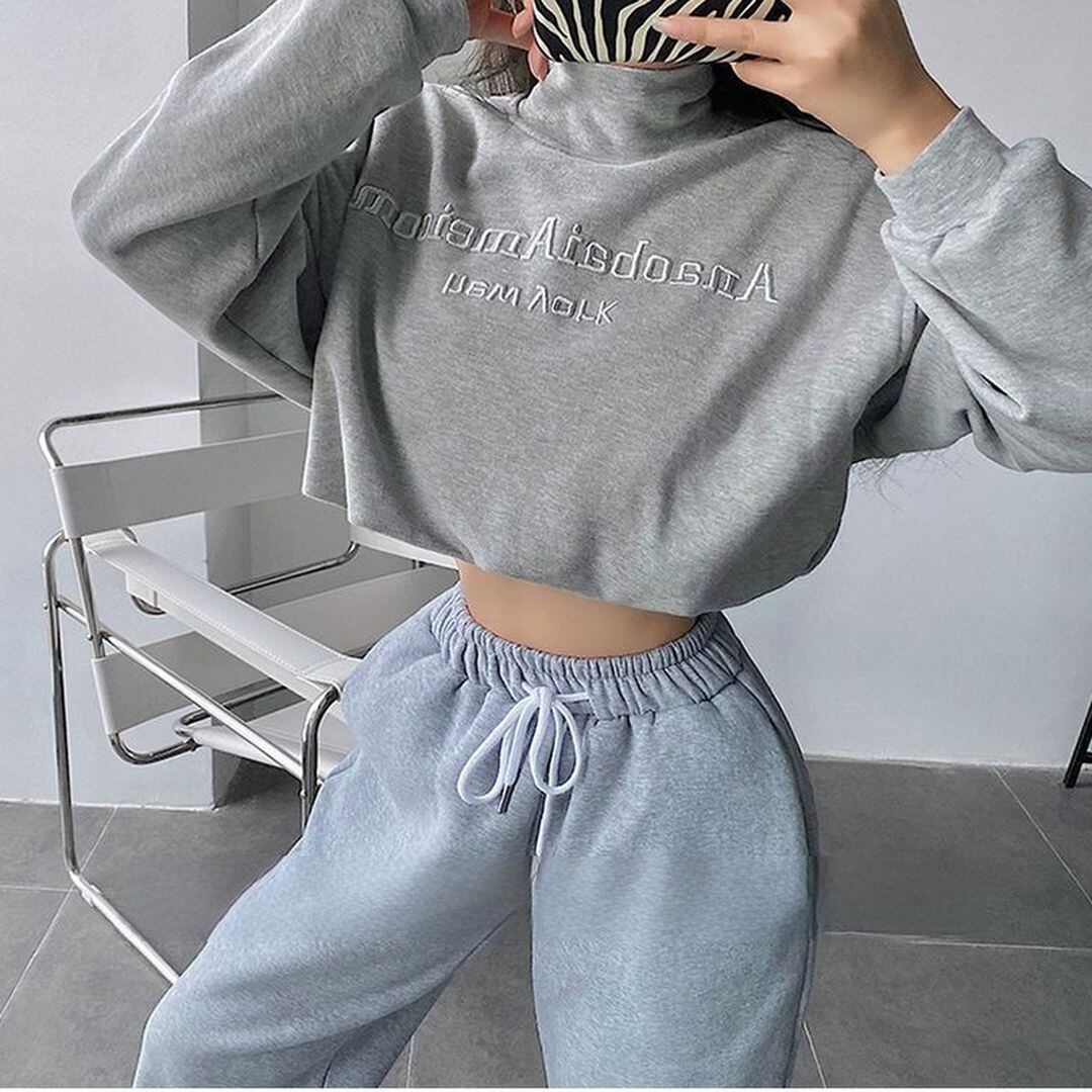 ハイネックとショート丈が魅力のスウェットシャツ。
