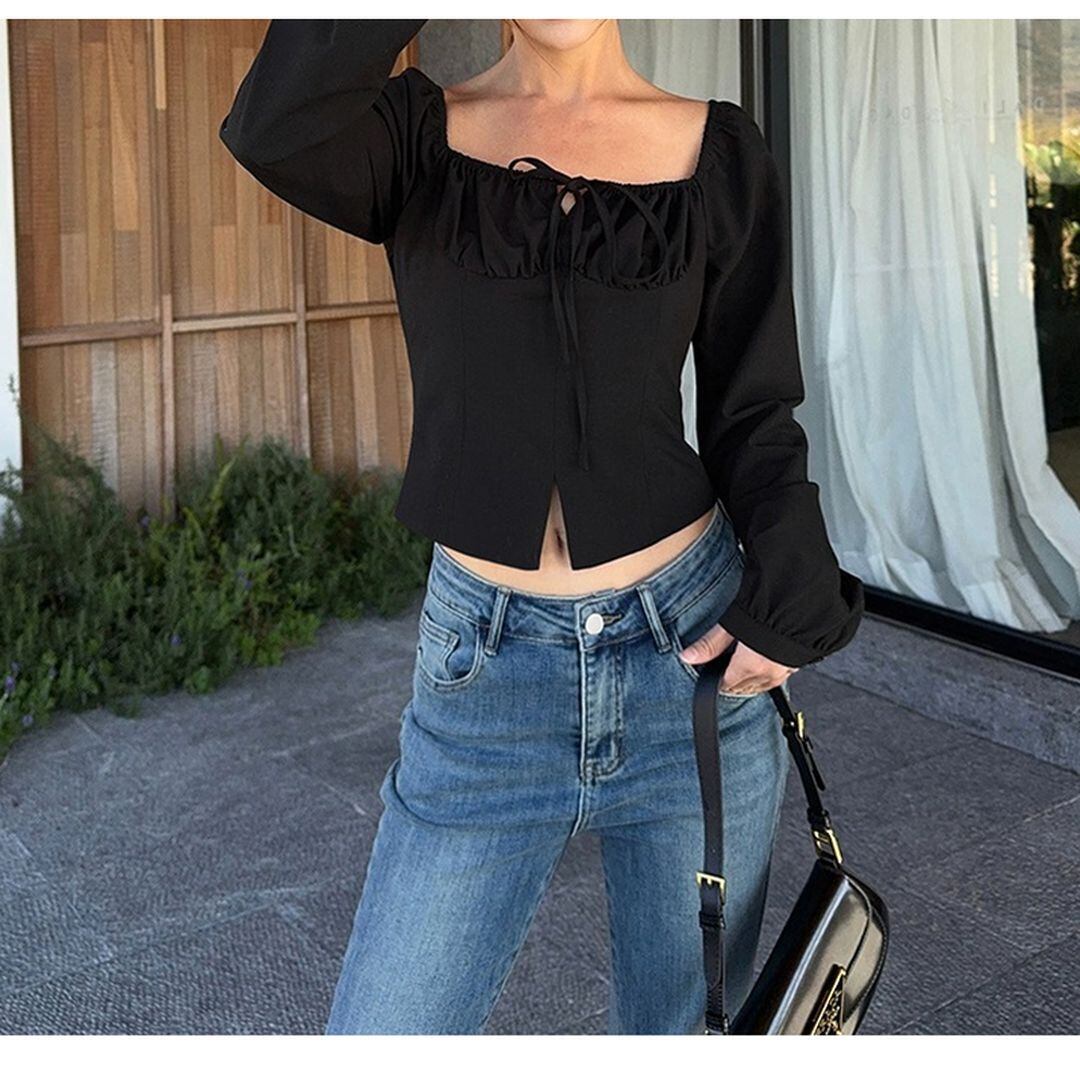 華やかなスクエアカラーとふわふわのパフスリーブのシャツ。