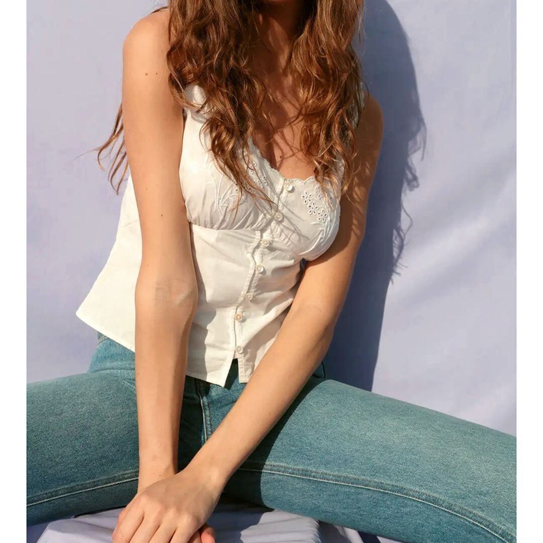 フラワーモチーフの刺繍が施されたノースリーブトップス。
