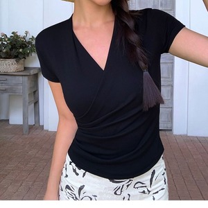 ウエスト周りにかけての斜めのドレープが着やせ効果に。