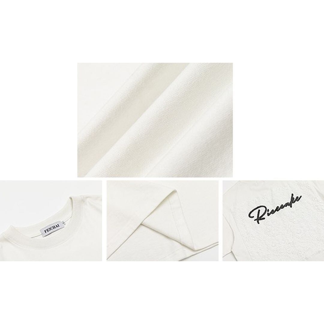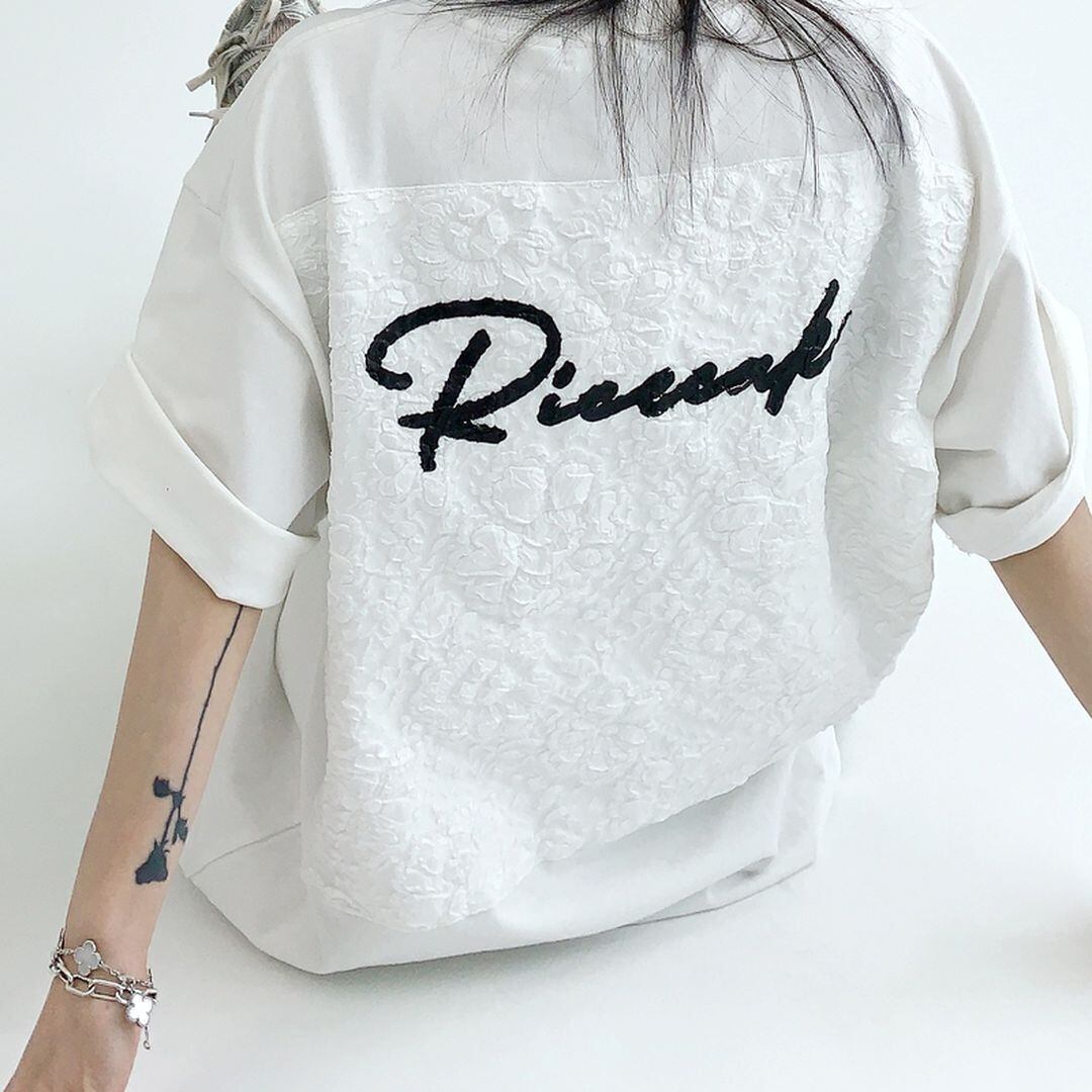 前からはシンプル、背中には英字と花模様が刺繍されたTシャツ。