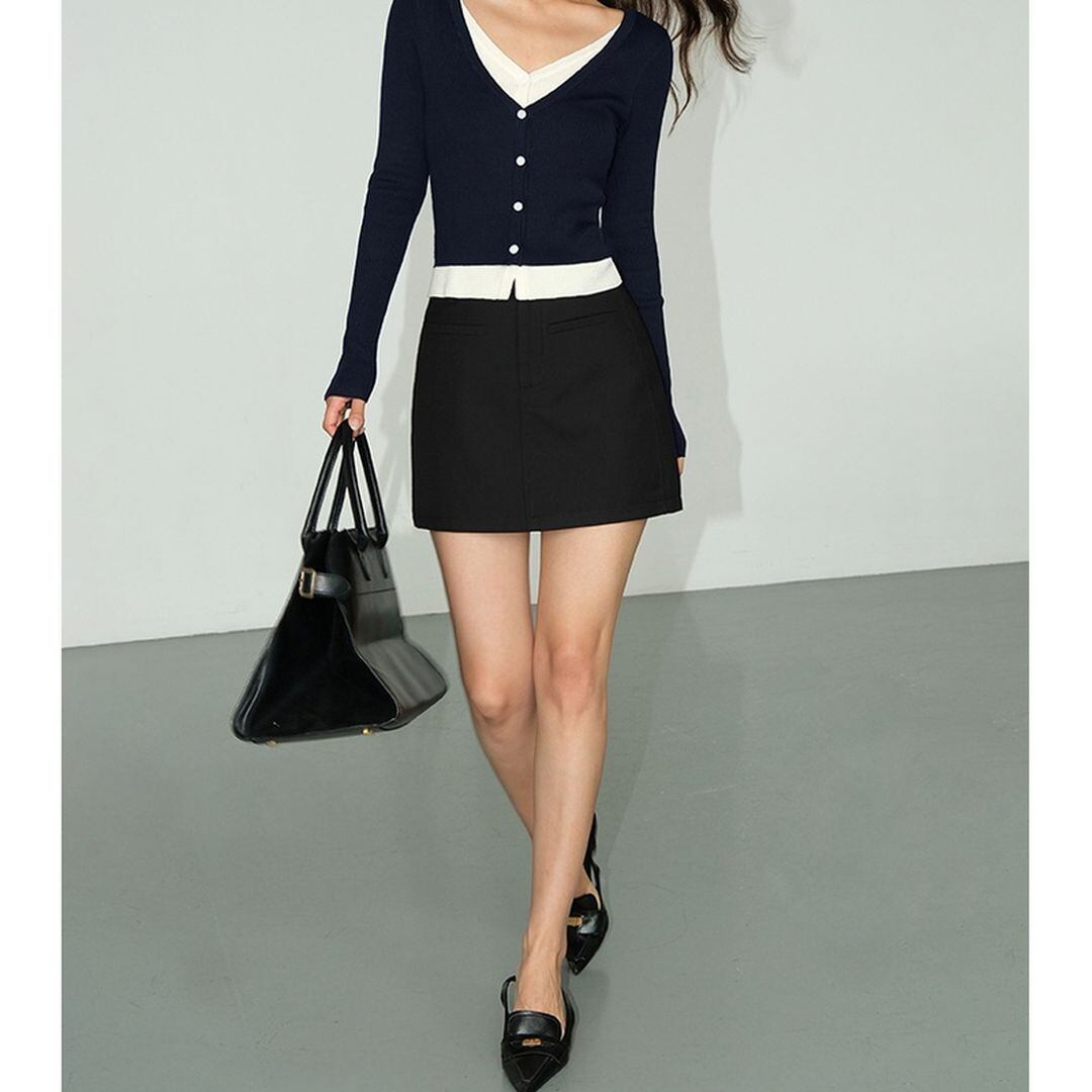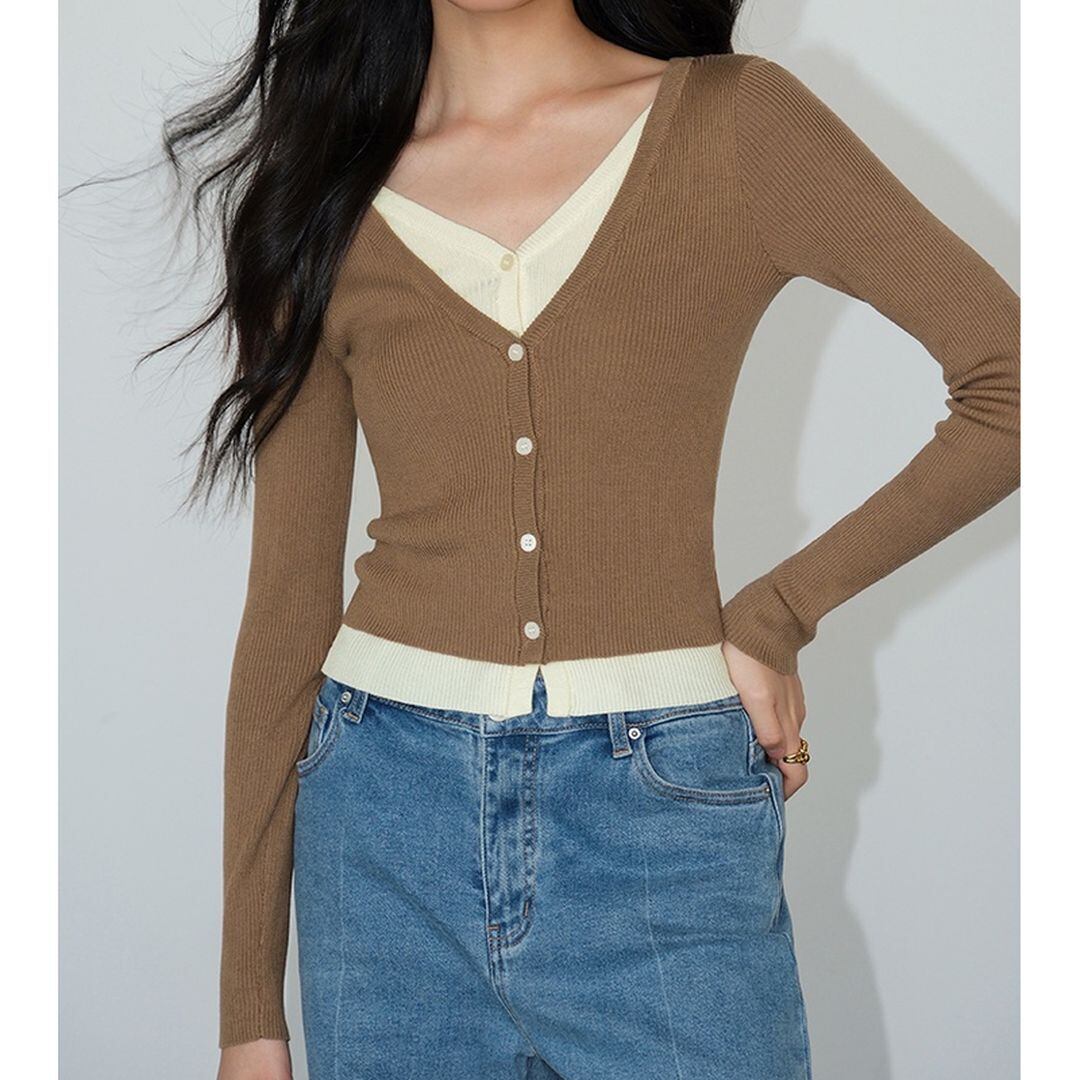 上品なVネックラインとツーピース風のデザインおしゃれなトップス。