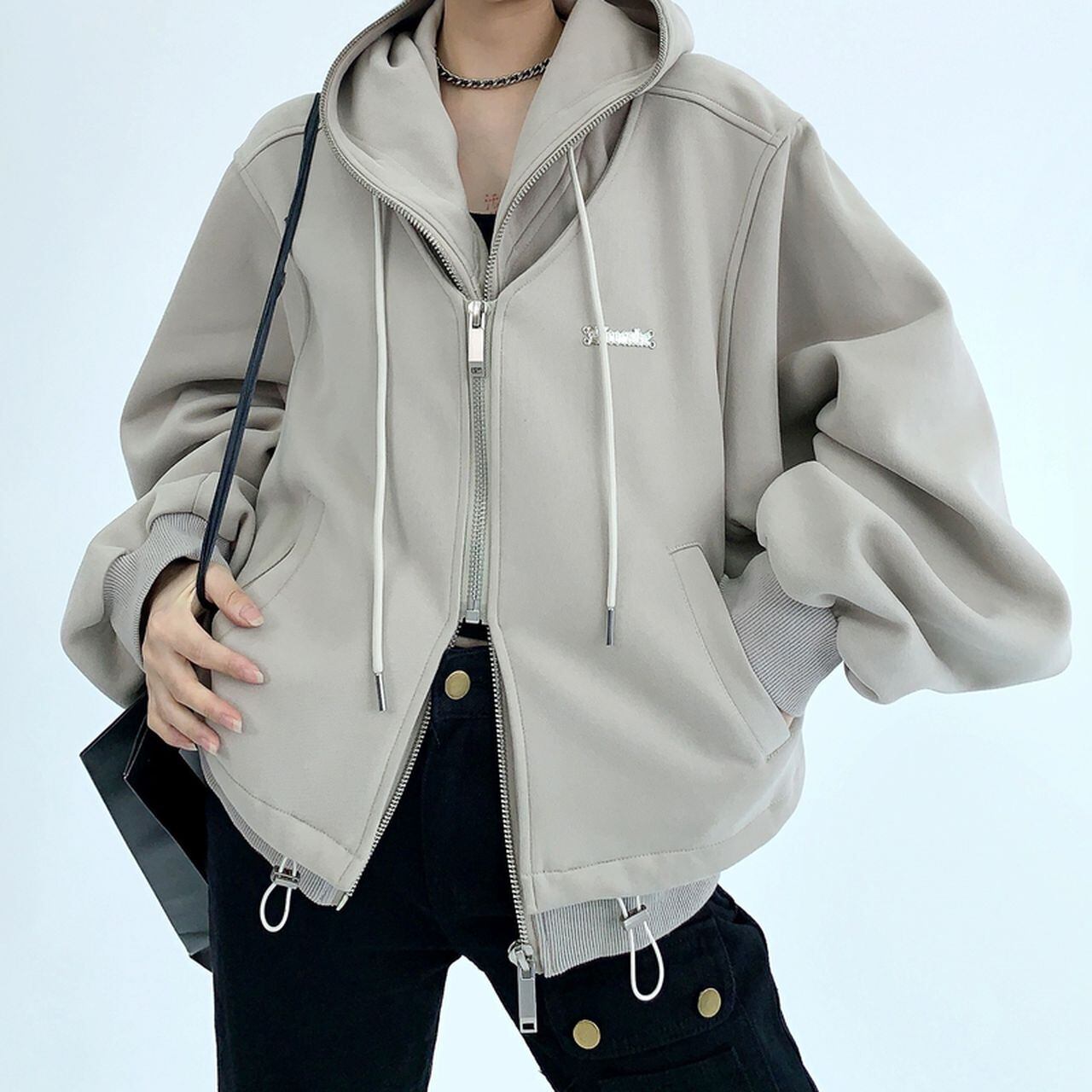 ルーズなシルエットが魅力的なフェイクツーピースジャケット。 フード付きでカジュアルながらもスタイリッシュなデザイン。 着るだけでレイヤースタイルを楽しめるアイテムです。 ◇カラー アプリコットグレー ブラック ◇サイズ:M,L,XL,2XL M 肩幅:54cm / 胸囲:122cm / 着丈:58cm / 袖丈:64cm L 肩幅:55cm / 胸囲:126cm / 着丈:60cm / 袖丈:65cm XL 肩幅:56cm / 胸囲:130cm / 着丈:62cm / 袖丈:66cm 2XL 肩幅:57cm / 胸囲:134cm / 着丈:64cm / 袖丈:67cm ◇素材 綿 ◇モデル 身長158cm:Lサイズ着用 ◇ ◇ ◇ ◇ ◇ ◇ ◇ ◇ ◇ ◇ ◇ ◇ ◇ ◇ ◇ ◇ SHOPの『ご購入前に必ずお読みください』をよく読んでから、ご購入をお願いします。 https://www.attcasu.com/about ◇ ◇ ◇ ◇ ◇ ◇ ◇ ◇ ◇ ◇ ◇ ◇ ◇ ◇ ◇ ◇ ◆Attcasu Ranking◆ https://www.attcasu.com/categories/2881988 ◆Attcasu Top page◆ https://www.attcasu.com/ 【お届けについて】 こちらの商品は海外店舗より直接発送となる為、 ご入金から2~3週間前後で発送致します。 ◆注意事項 ・タイミングによっては 商品在庫切れにより 注文キャンセルとさせていただく恐れもございますので、予めご了承くださいませ。 ・こちらは輸入品となります。日本製とは検品基準が異なる為、 新品未使用品でもごくわずかな汚れや ほつれがある場合もございます。 ・仕入れ工場を変えることがあるため、記載サイズと若干異なる場合がございます。 ・商品の色味は、お使いのデバイスや環境による違いによって実物と若干異なる場合がございます。 ・イメージ違いやサイズ交換等、お客さまご都合による交換、返品は対応出来かねます。 ◆◆◆◆◆◆◆◆◆◆◆◆◆◆◆