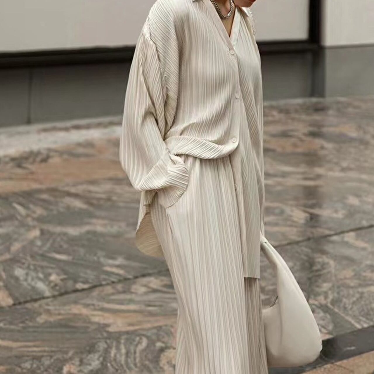 きれいめなプリーツデザインの長袖シャツとパンツのセットアップ。