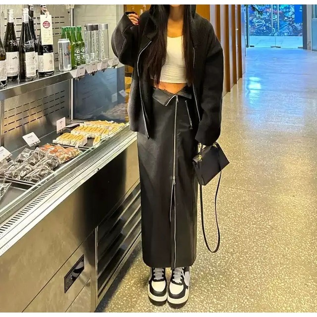 エレガントな印象を与えるダブルファスナースリットハイウエストレザースカート。