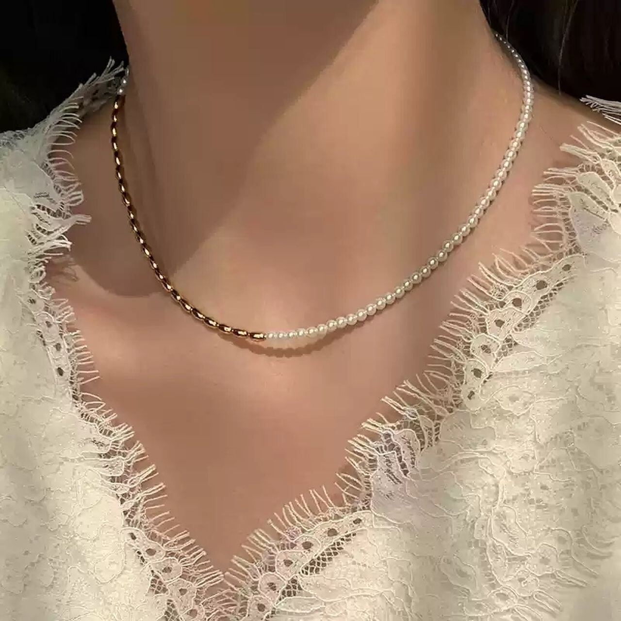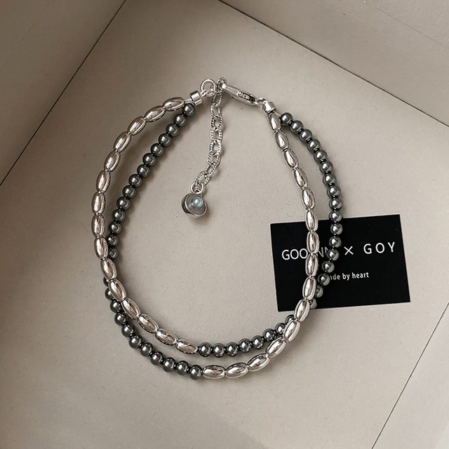 シンプルでありながら、華やかさを添えるビーズ二層カラーブロックパールネックレス&ブレスレット。